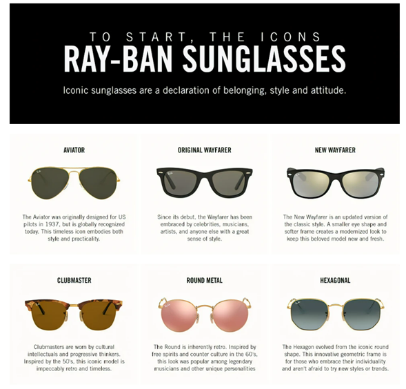 Ray-Ban is the world’s most iconic eyewear brand and is a global leader in its sector. Every model in the Ray-Ban collection is the product of meticulous, original styling that translates the best of the latest fashion trends into an ever-contemporary look for millions of Ray-Ban wearers around the world. From the early Aviator style that emerged in 1937 to the introduction of the classic Wayfarer in 1952, Ray-Ban is a brand that embodies America, adventure, great cities, wide-open spaces, heroism, individuality, and authenticity.
