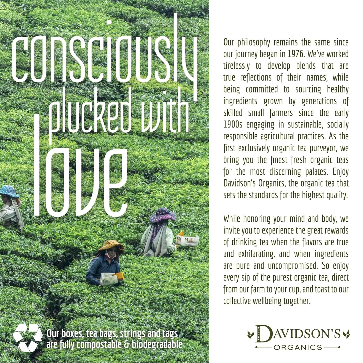 • TRUST OUR TEA: Davidson's Organics was the first purveyor of fine organic teas. Since 1976, we’ve worked tirelessly to develop blends that are true reflections of their names, while being committed to sourcing healthy ingredients grown by generations of skilled small farmers. Enjoy Davidson's Organics, the organic tea that sets the standards for the highest quality.
