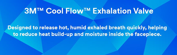 - 3M COOL FLOW EXHALATION VALVE: Reduces heat build-up inside the respirator. Making it suitable for work situations involving heat, humidity, or long periods of wear.