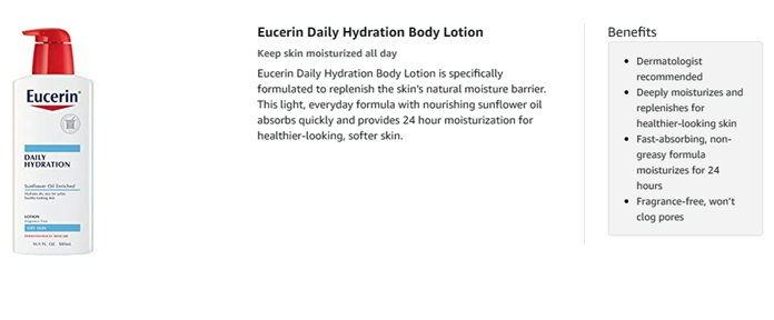 • Daily Moisturizing Lotion: This Eucerin lotion for dry skin is perfect for daily use, and delivers 24 hour moisture for soft, healthy-looking skin