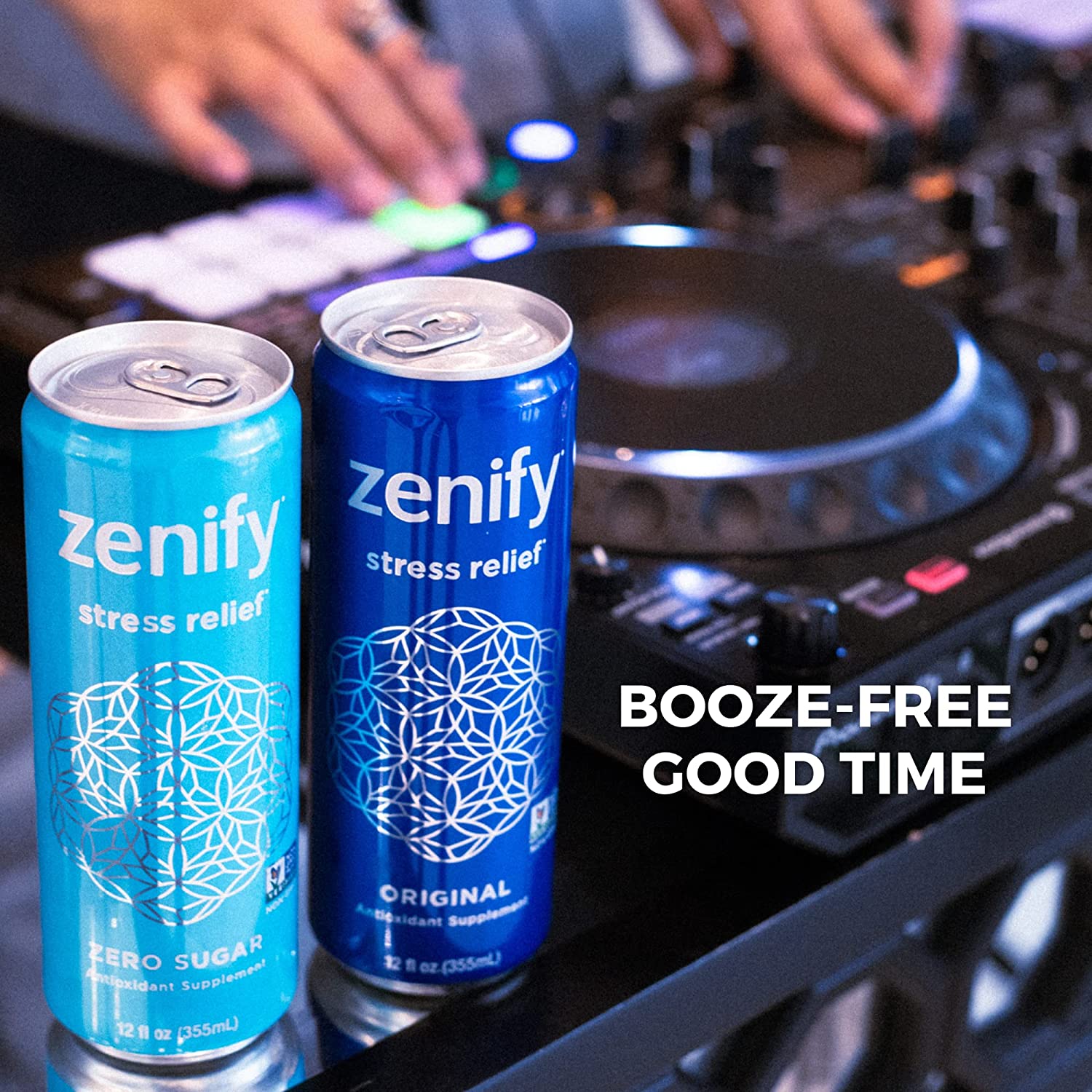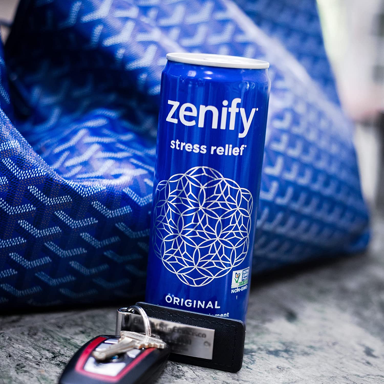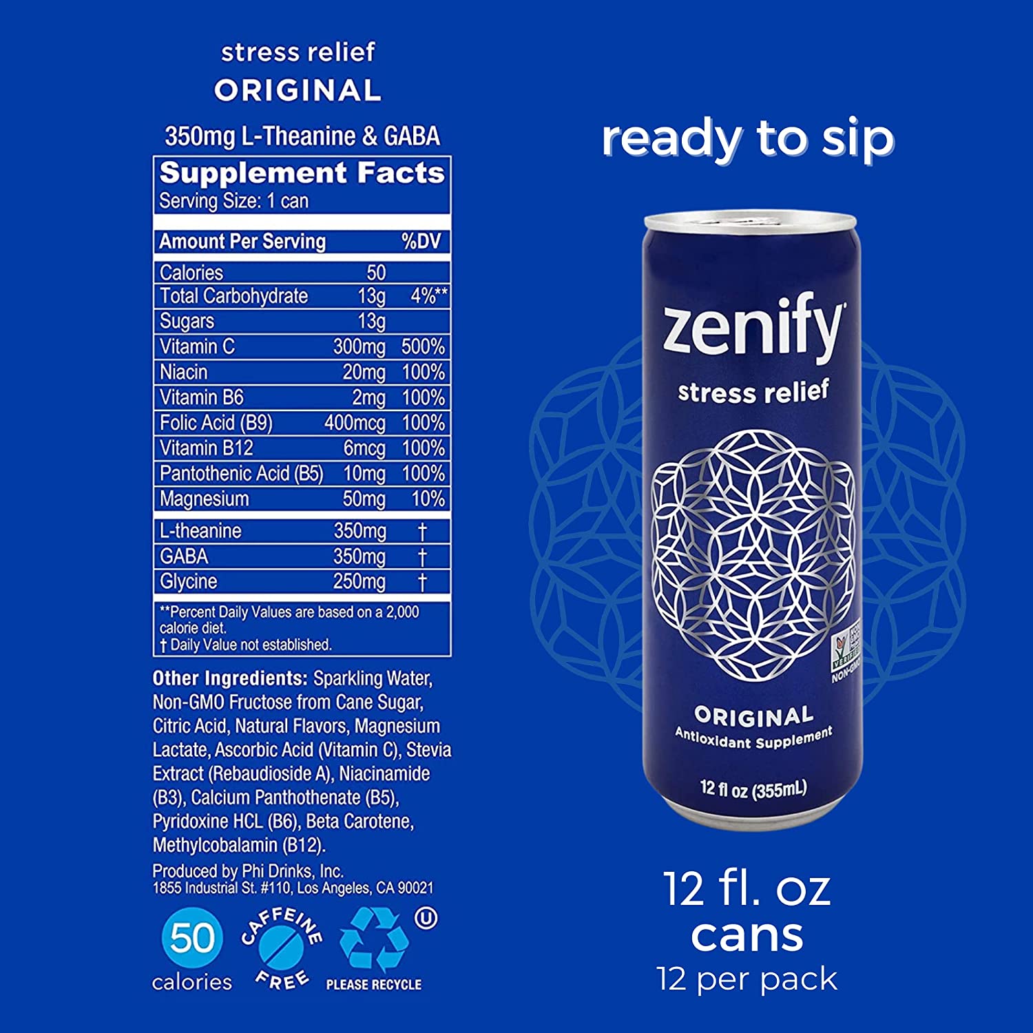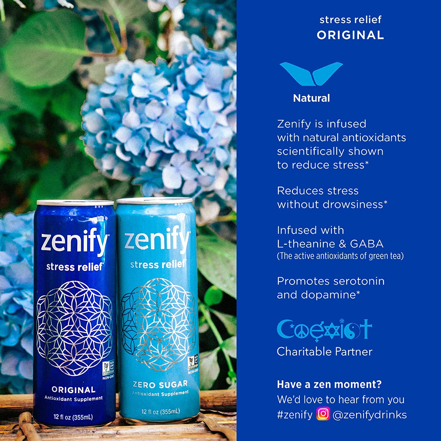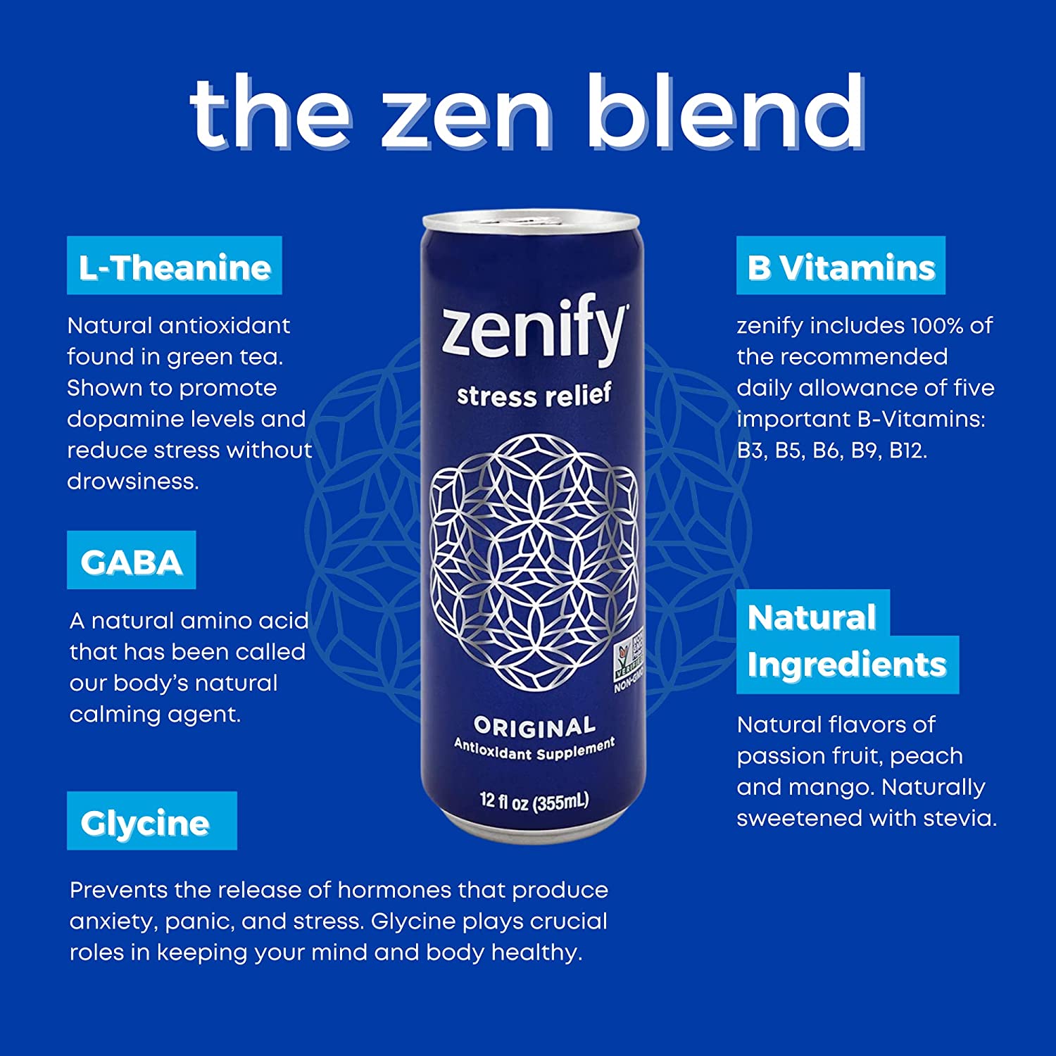 About this item            Zenify Original all natural sparkling beverage is designed to help you reduce stress, stay focused, creative, and productive. Drink Zenify Original throughout the day without any side effects.   Zenify Original is an all natural, relaxation drink infused with the same stress-relieving antioxidants found in 25 cups of green tea with no caffeine.  Zenify products increase focus and enhance vitality while reducing stress. With a unique blend of l-theanine, GABA and glycine, zenify should be help people achieve their optimal state of being-relaxed yet focused and alert.  This uniquely balanced function makes zenify the ideal choice for the office, the classroom or the field.  Other Benefits Include: L-Theanine: Elevate serotonin and dopamine levels | GABA: Help produce endorphins | Vitamins: Consume 100% of the recommended daily allowance of five important B-vitamins – Vitamins B-3, B-5, B-6, B-9 and B-12