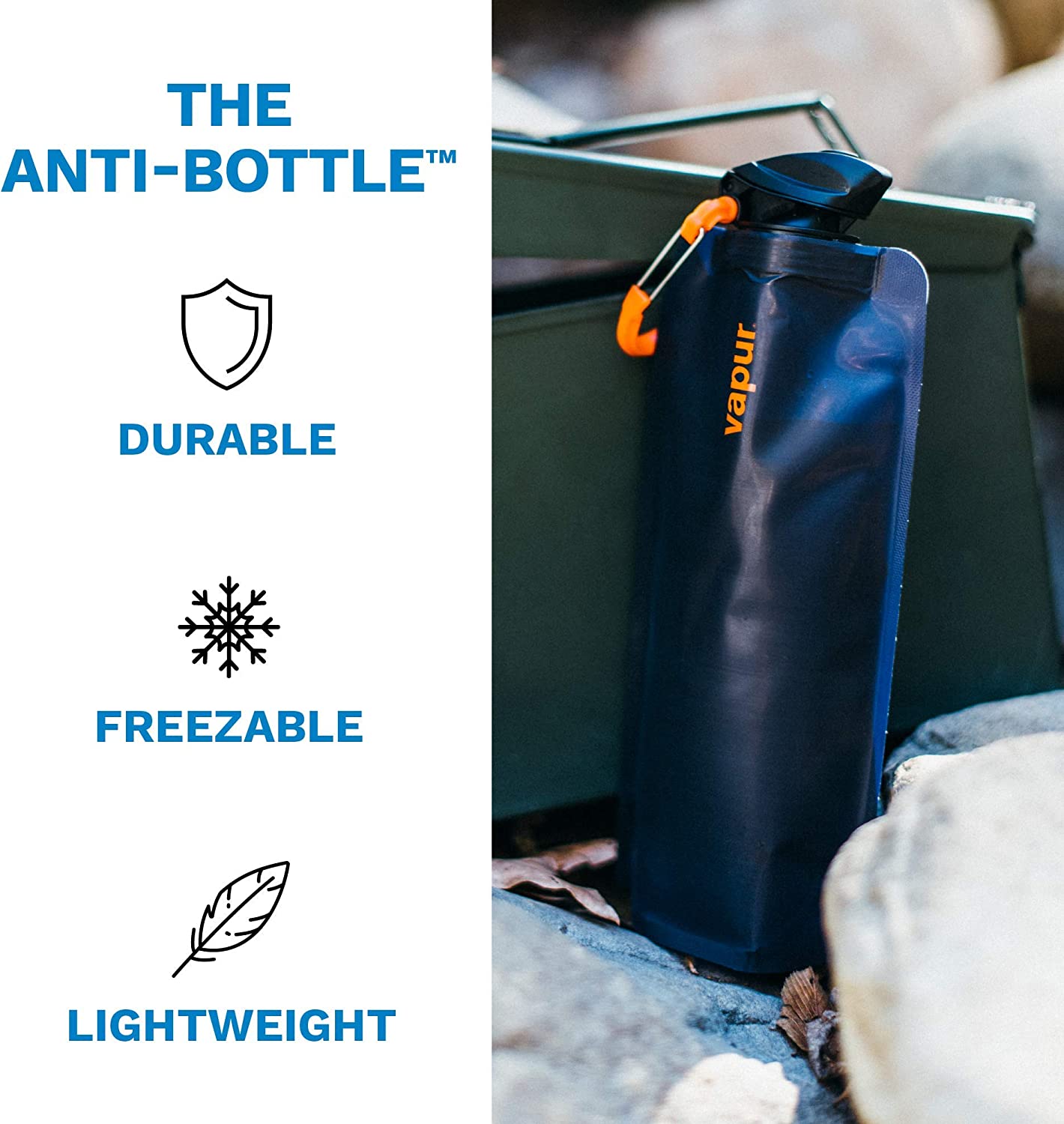 Mission: To inspire and support active lifestyles with innovative, ultimately portable, products. Live Flexible. California-based Vapur started in 2009 as a big idea with a simple solution. With unwelcome waste creeping into the social conscious and light shed on the ugly aftereffects of plastic, three avid outdoorsmen set out to find an answer. This team, led by a commitment to design, innovation and eco-responsibility, was on a mission to make hydration incomparably portable and disposable bottles obsolete. The Anti-Bottle is a reusable water bottle designed to stand when full and can be rolled, folded or flattened when empty, making it easy to use and carry on any adventure. Unlike bulky, rigid bottles, the portable Anti-Bottle can be easily tucked away, conveniently fitting into pockets, purses and packs. About 87percentage lighter than typical rigid bottles, the slim, flexible Anti-Bottle only packs water weight. It also uses less energy to make and transport than rigid bottles, so not only is the Anti-Bottle light on your load, its environmental impact is also pretty “lite.” Now as the leading designer, marketer and distributor of reusable, handheld, collapsible hydration products, Vapur’s Anti-Bottles have been adopted by athletes, celebrities, activists and families alike. Vapur Anti-Bottles are reusable, flexible, collapsible, durable, freezable, dishwasher safe and BPA-free. Now drink up and as always, "Live Flexible."