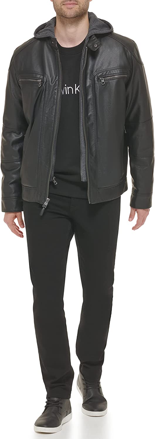 Calvin Klein Men's Faux Lamb Leather Moto Jacket with Removable Hood and Bib
