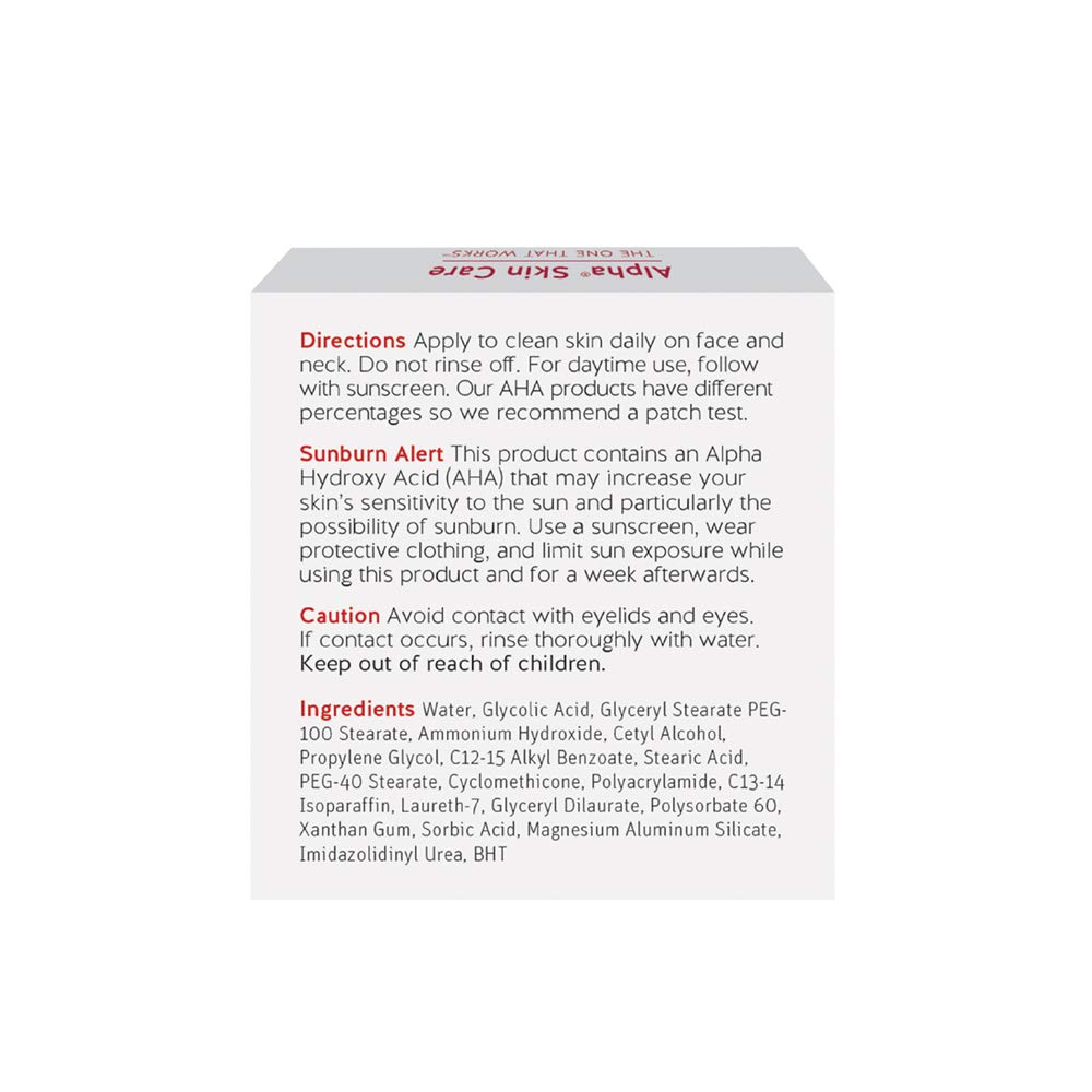 DIRECTIONS: Apply to clean skin on your face and neck. Do not rinse off. For daytime use, follow with a sunscreen. Our AHA products have different percentages so we recommend a patch test. May be used morning and evening.
