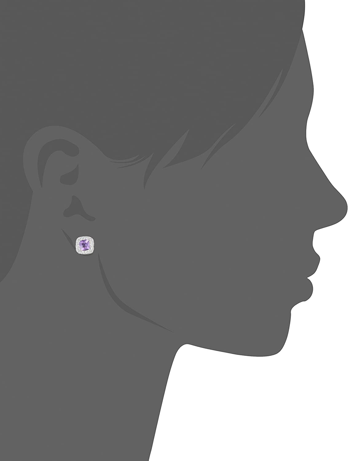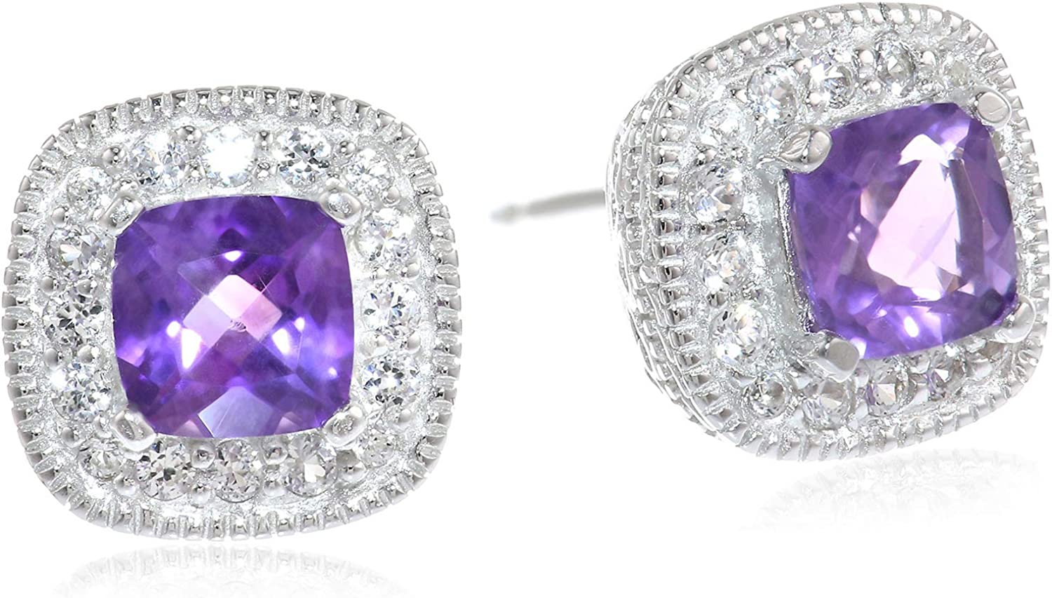 Amazon Collection Sterling Silver Cushion Cut Birthstone and Created White Sapphire Halo Stud Earrings