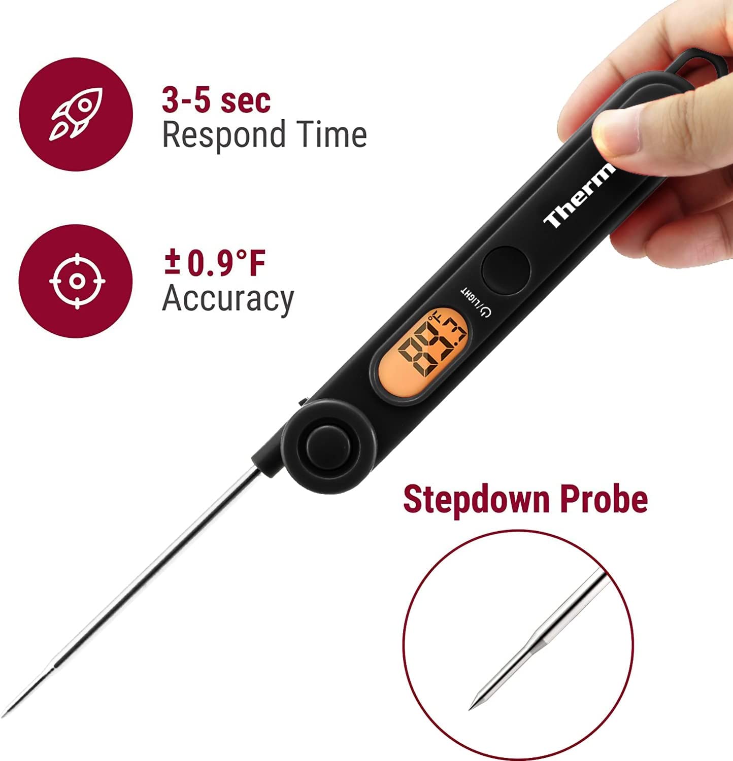 • Super-fast: Instant reading thermometer with backlight features 3.9 inches food grade stainless steel probe gets temp readout within 3-5 seconds with high precision sensor