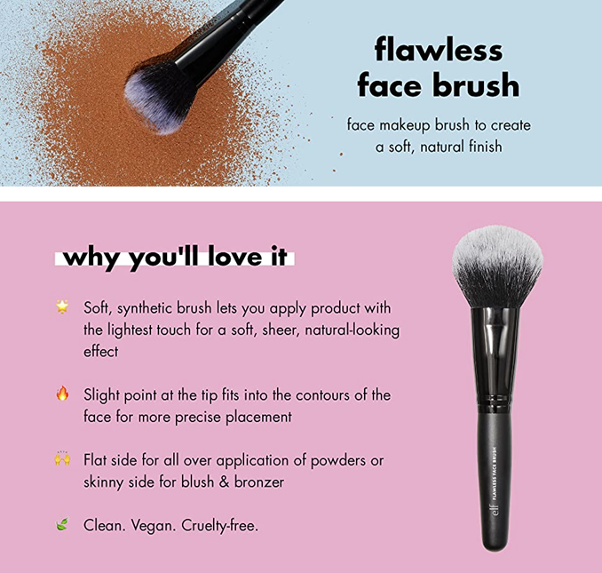 CREATES A NATURAL LOOK: The e.l.f. Flawless Face Brush is a soft, synthetic brush that lets you apply product with the lightest touch for a soft, sheer, natural-looking effect.