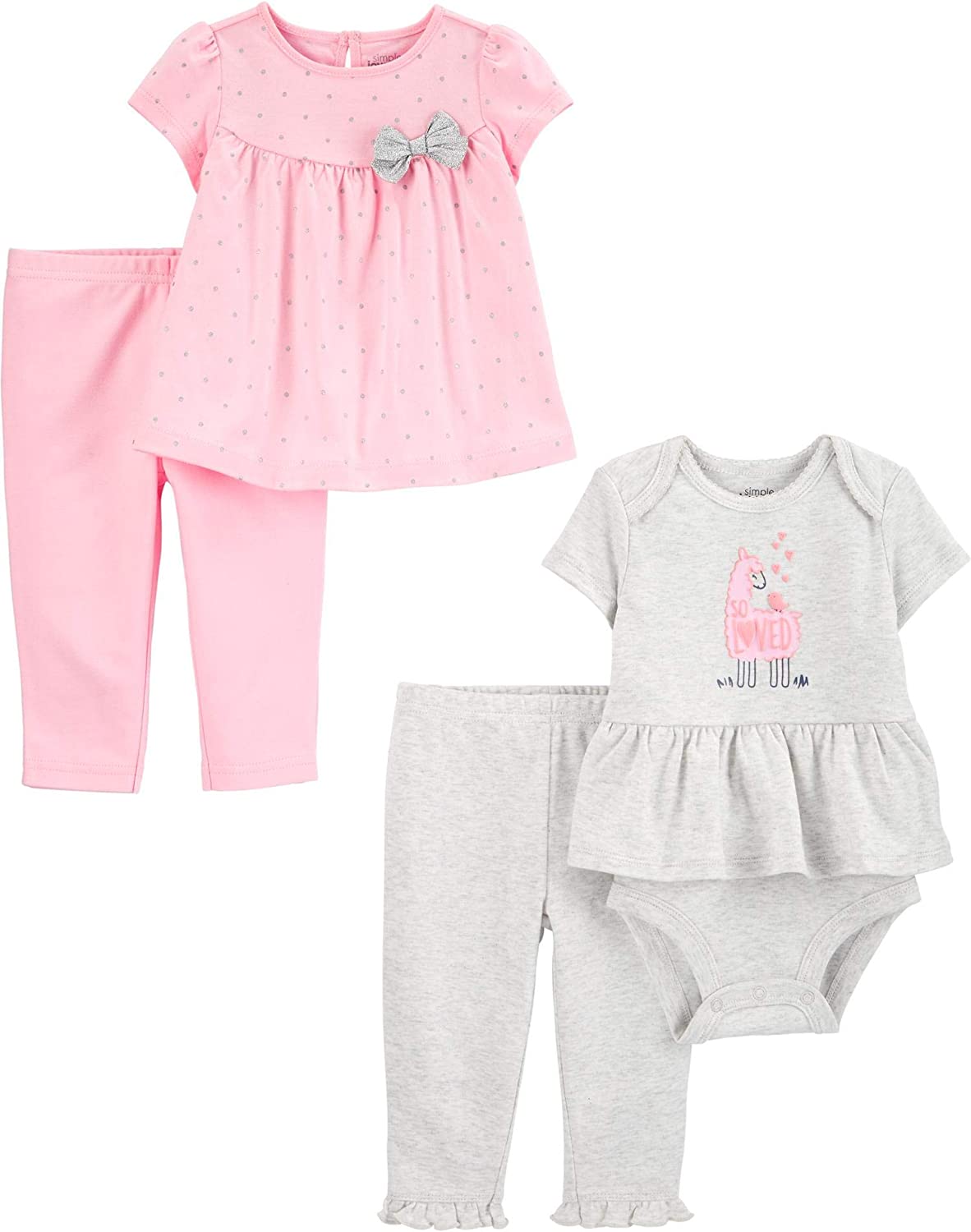 Featuring ruffles, floral prints, and cute critters, this 4-piece mix-and-match set includes two body suits and two pants.