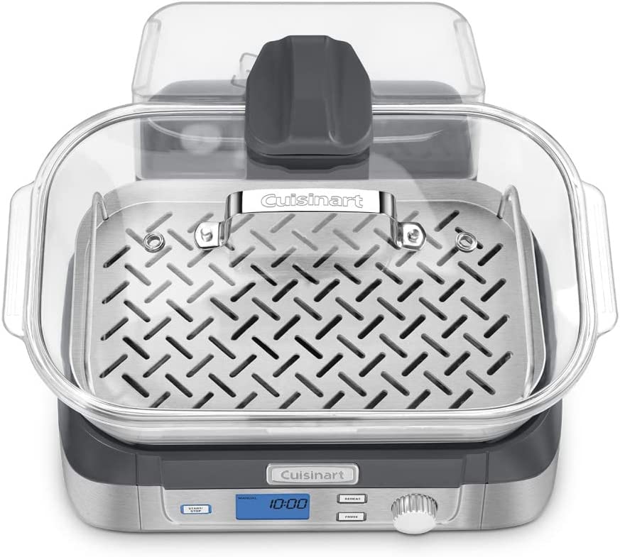 Consumers looking for a healthy way to cook will love Cuisinart's new Cook Fresh Digital Glass Steamer. A powerful steam system delivers steam from the top down, surrounding food to cook quickly and evenly. The 5-liter glass cooking pot is large enough for family-size portions of vegetables, fish, chicken, rice and more. And the steamer's 1-liter water tank conveniently lifts off to fill. Healthy cooking is today's biggest trend, and this new glass steamer from Cuisinart makes it quick and easy. Features: Powerful steam system|5L dishwasher-safe glass pot|5 preprogrammed food settings: seafood poultry grains vegetables and manual|60 minute countdown timer|LCD control panel|Audible alert|Start/Stop Pause & Reheat buttons|1L removable water tank|Stainless steel steaming tray flips to hold different types of food|Glass lid with stainless steel rim|Limited 3 year warranty|BPA-free