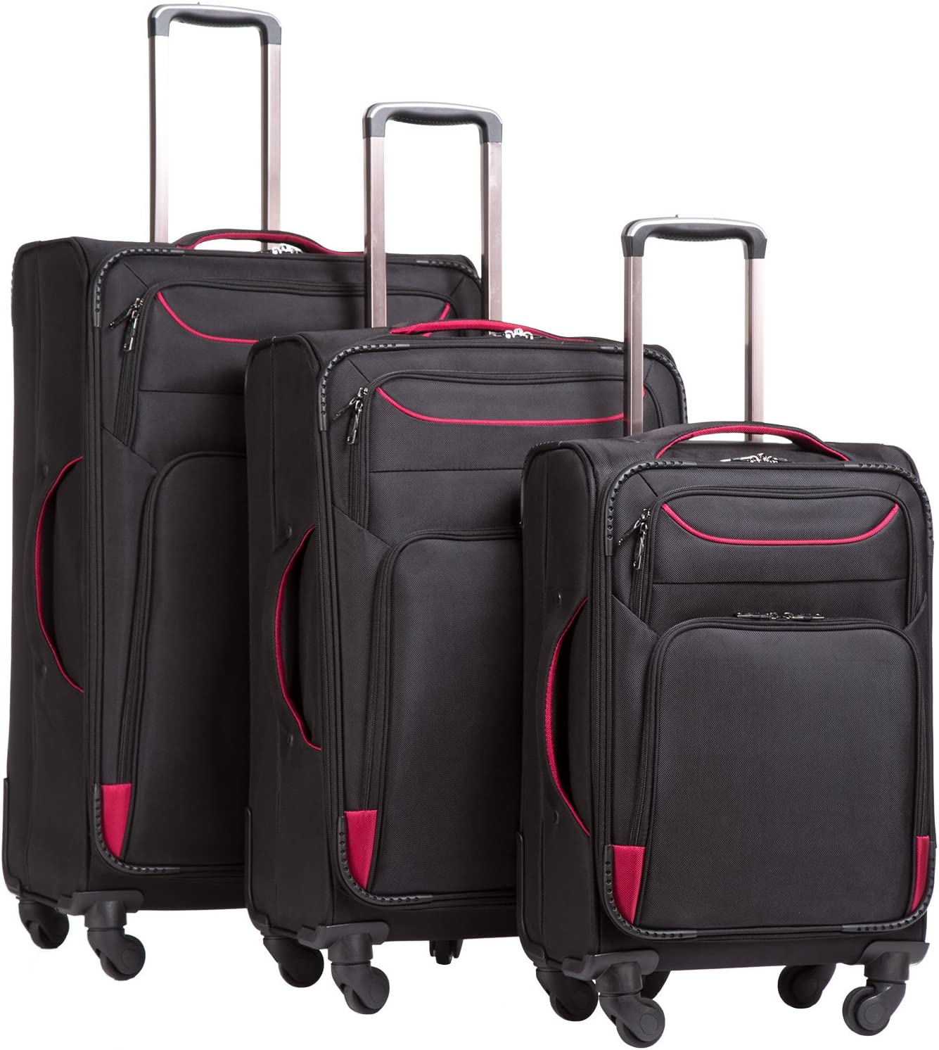 Worldwide 2 year warranty. The sets include a 20 inch carry-on luggage, 24 inch medium luggage, 28 inch large luggage and a 15 inch tote bag.