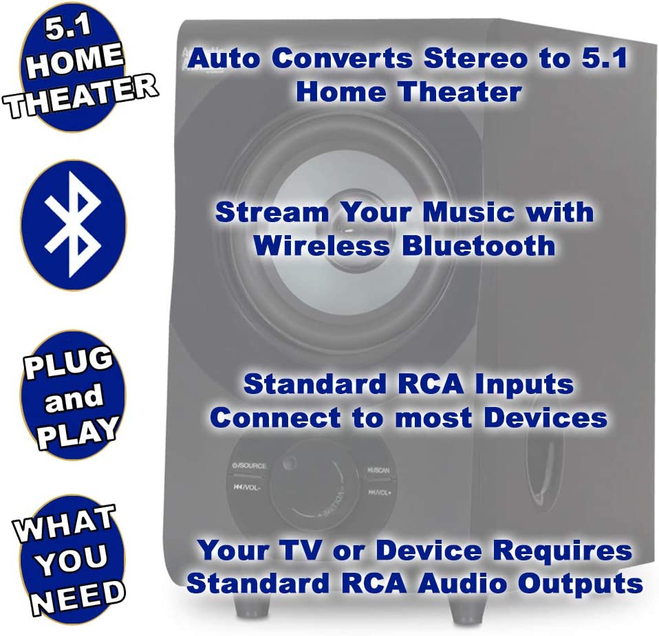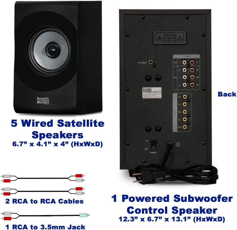 Acoustic Audio by Goldwood AA5172 Bluetooth 5.1 Speaker System Stream music from your phone to the built in Bluetooth Receiver Integrated Power Amplifier with 700 Watts System Power Pro Surround Function Automatically Converts Stereo to 5.1 Sound Easy Plug and Play Connections. Standard RCA inputs connect to most audio sources 6 Independent RCA Inputs for True Surround Stereo RCA AUX Inputs Illuminated Display with Front Panel Controls USB Drive Input and SD Card Input FM Tuner Full Function Remote Magnetically Shielded Wired Satellite Speakers 1 Powered Subwoofer Speaker is (H x W x D) 12.3" x 6.7" x 13.1". Frequency Response is 20Hz-20 kHz Enhanced Bass Boost Ported Design 5 Wired Satellite Speakers are (H x W x D) 6.7" x 4.1" x 4" each 2 Front and 1 Center Satellite Speakers have 6 Foot Single RCA Cables 2 Rear Speakers have 12 Foot Single RCA Cables System Requirements Standard US 110V Grounded Wall Plug Any audio device with a standard 3.5mm Headphone, RCA Stereo or RCA 6 Channel Surround Audio Outputs Search AA5170D for this model with Smart TV Digital Optical Input Applications TV or Home Entertainment System Laptop or Personal Computer DVD or MP3 Player Cell Phone or Tablet Gaming What's in the box 1 Powered Subwoofer Speaker 5 Passive Wired Satellite Speakers Full Function Remote RCA Antenna Cable 3.5mm to RCA Cable RCA to RCA Jack Cable Instruction Manual