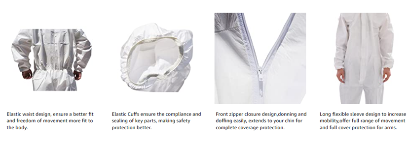 - Elastic at Cuffs,ankles,waist design;Zip front opening,serged seams and attached hood help reduce exposure