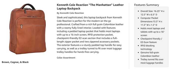 Look cool, calm, and collected with this Kenneth Cole Reaction 'Manhattan' collection full-grain, Colombian leather, slim double compartment EZ-scan TSA checkpoint friendly 16” laptop computer travel backpack. Perfect slim laptop backpack for professionals, work, business, travel, school, college, students, and daily commuters. Designed with travel in mind, the bag Includes a checkpoint-friendly/ EZ-scan feature that complies with TSA guidelines so your laptop does not need to be removed when passing through airport security checkpoints, allowing you to get on your way faster. Holds most laptops with up to a 16” screen and features a separate, padded tablet pocket that fits most tablets with up to a 12.1” screen. Made of a full grain cowhide leather exterior body material, along with the fully lined interior that keeps you looking polished and professional. The front exterior includes a small zipper pocket, lined with brushed soft polyester to protect your valuables, a lower easy-access zipper pocket, and a larger zip down pocket that features an extensive organizer to hold a variety of business essentials (including a padded iPhone pocket and room for a key fob). The well-organized front main compartment features a file pocket, mesh zipper pocket, and a padded tablet pocket. The rear compartment is padded to hold a laptop, and the EZ- scan section includes a full-length zipper pocket, as well as two zippered accessory pockets. An additional secret RFID protected zippered stash pocket can be found on the interior of the lower back padding, helping keep you safe from credit card and Identity theft. A sturdy and comfortable top handle accompanies padded backpack straps with ultra-padded air mesh with an air flow system (AFS), and a trolley tunnel, made to fit over most upright trolley handles. This leather laptop travel backpack is perfect for professionals whom value both style and function. ★ Backed by a manufacturer’s lifetime limited guarantee against defects. ★ Overall Size: 16.25” H x 12.5” L x 6.5” D. ★ Laptop Computer Dimensions: 15.5” H x 11.5” L x 1.5” D. ★ Product Weight: 3.15 lbs. ★