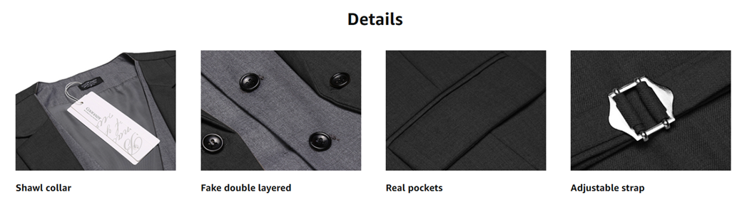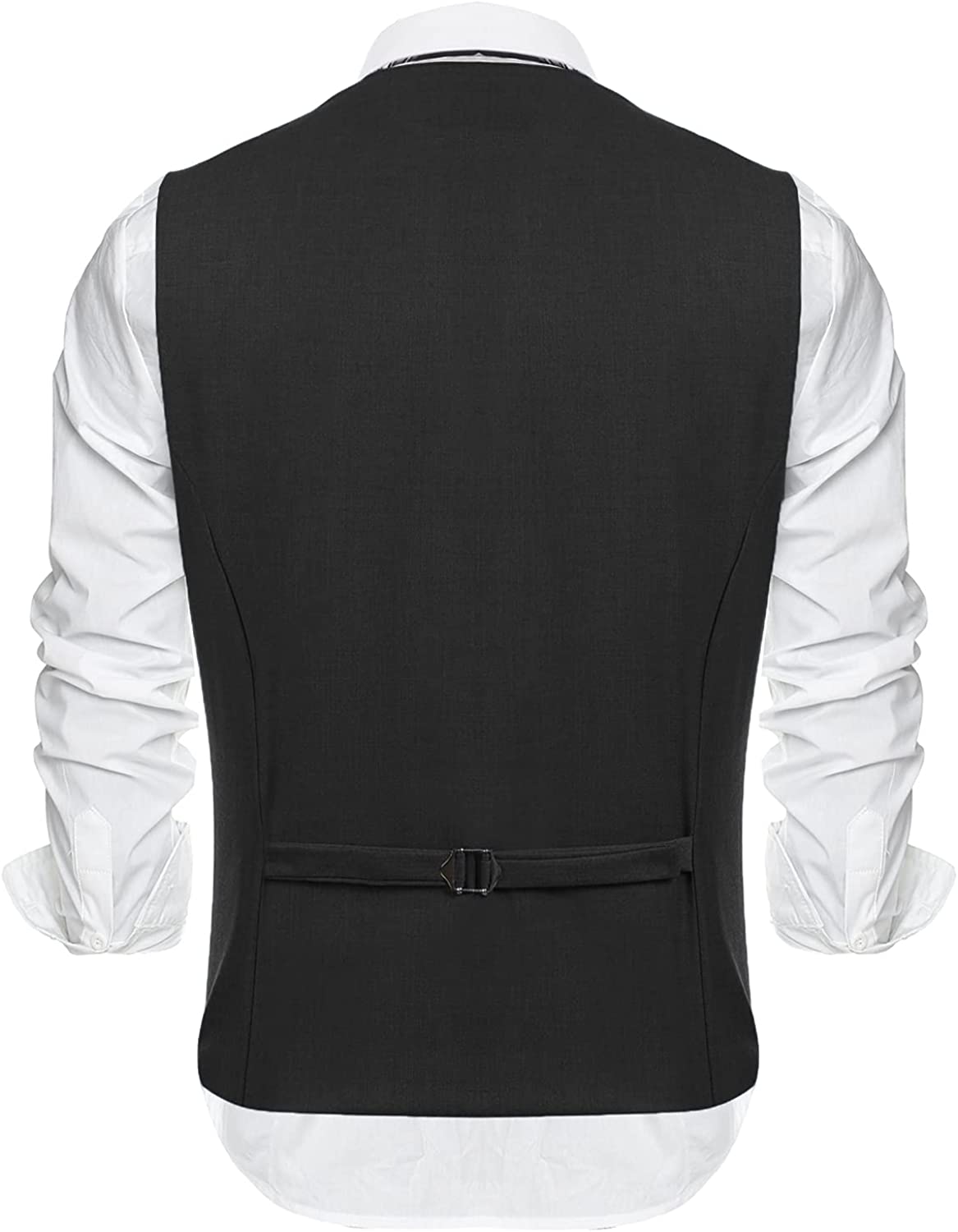 - STYLISH DESIGN - Men's layered dress waistcoat is designed to doulble layer, adjustable back strap, V-neck, sleeveless, 4 buttons, classic single breasted. Easily stands out from usual suit coat yet looks very handsome.