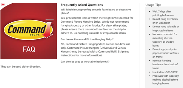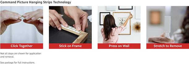 Command White Large Picture Hanging Strips let you decorate how you want, when you want, without damaging surfaces. A great home improvement item, these picture hangers stick on a variety of smooth surfaces without leaving holes, marks or sticky residue. Use these wall hanging strips to hang picture frames, college dorm decor, wooden letters, nursery decor, calendars or to create a gallery wall. Simply mount these picture strips on painted walls, finished wood, painted concrete cinder blocks, laminate, glass, metal and tiles and enjoy the damage free hanging of your favorite decorations. Perfect for home renovators and college students, use these Command Picture Hanging Strips in your home, office, apartment or dorm room to elevate the appearance of your living or working space without tools. Directions are included; follow the directions closely to use the 3M Wall Hanging Strips as intended. A clever decorating solution that doesn’t damage surfaces, these wall hanger strips will help you fearlessly change your space. One package contains 14 pairs of large white picture hanging strips. Four adhesive strip pairs hold up to 16 pounds with a maximum frame size of 24 x 36 inches. Decorate, organize and celebrate damage free with Command.
