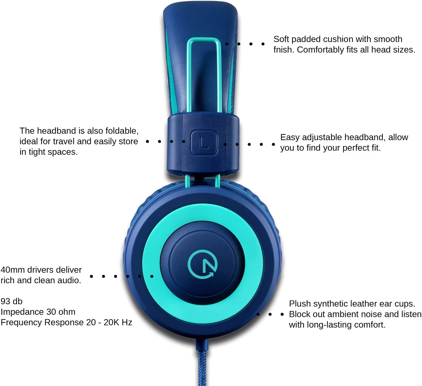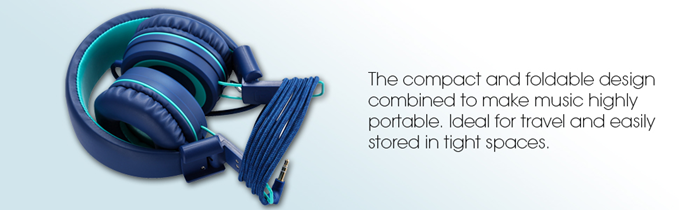 - On-ear headphones has padded soft cushions with a soft touch finish. Adjustable headband for a perfect fit, and a lightweight design for kids age 3 and up. Foldable design for a more compact and easy storage. The cord is a 5 feet long nylon braided cable. Designed for kids, girls, boys, children, toddlers, home/online school, training.