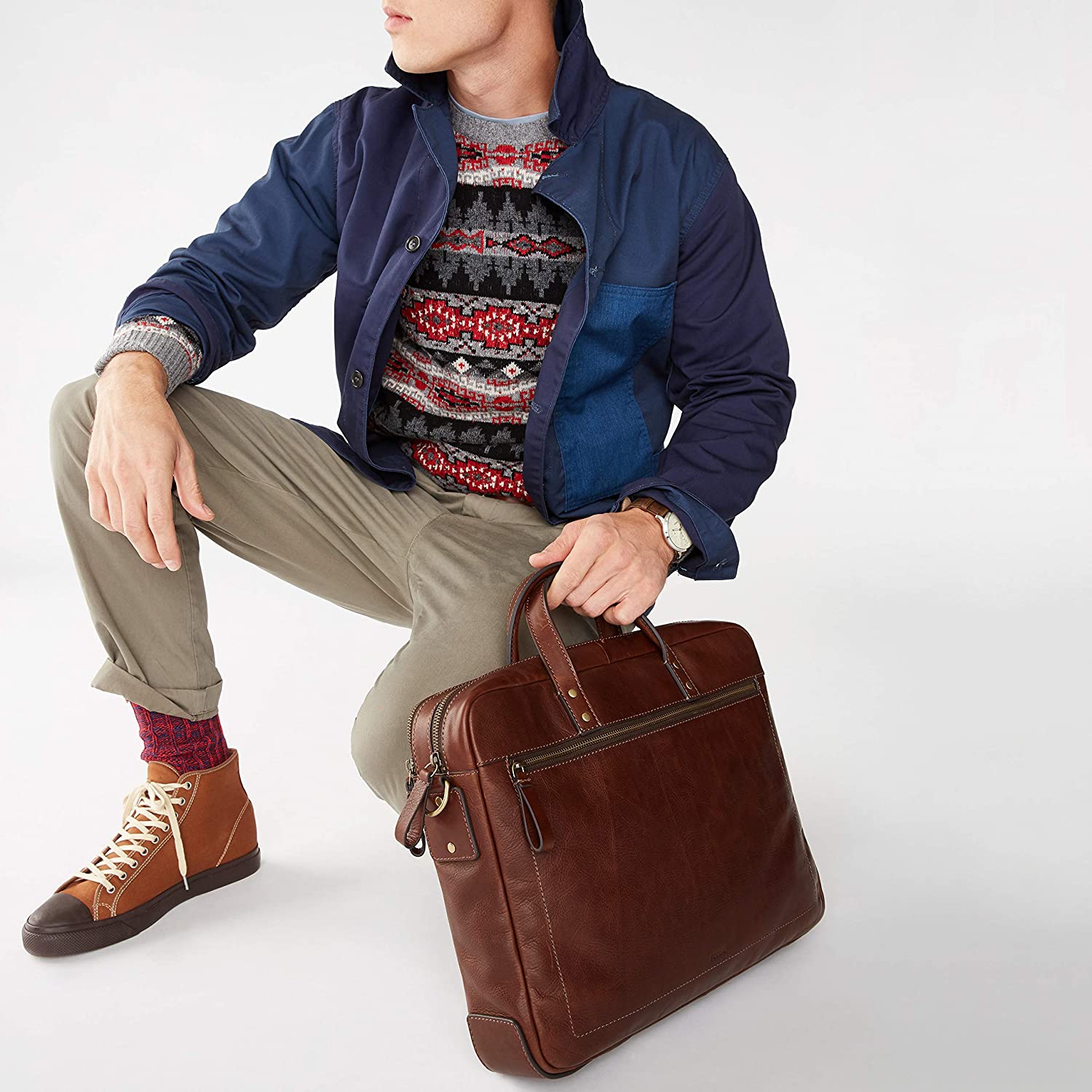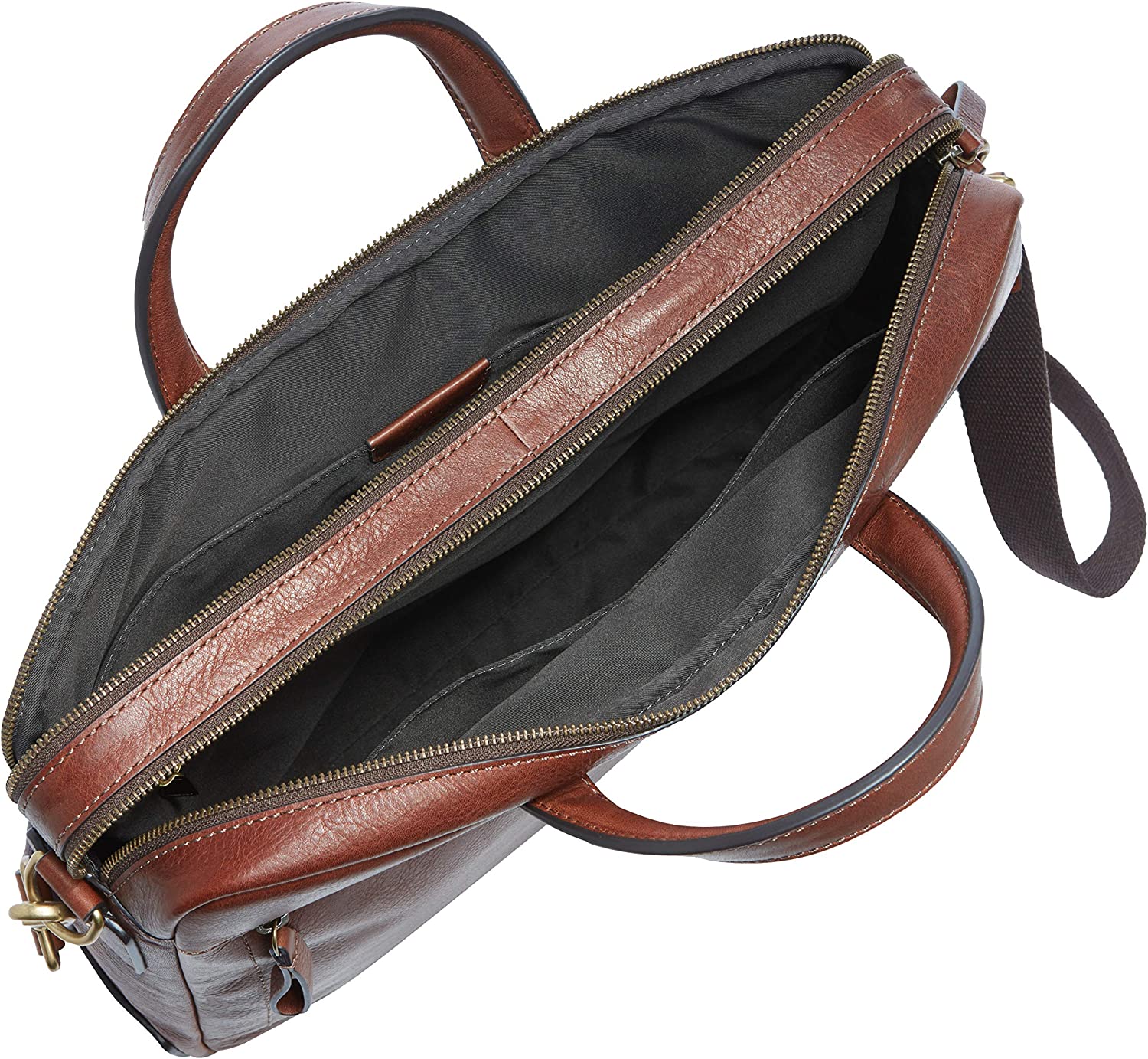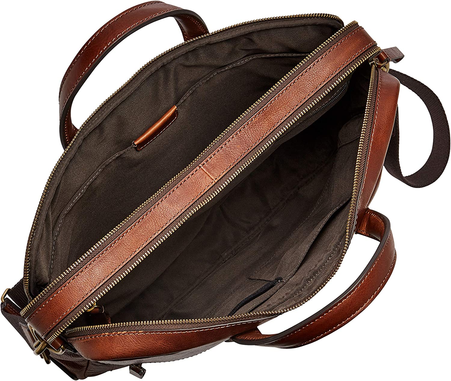 Fossil Men's Haskell Leather Double Zip Briefcase Messenger Laptop Bag, Cognac , (Model: MBG9342222)