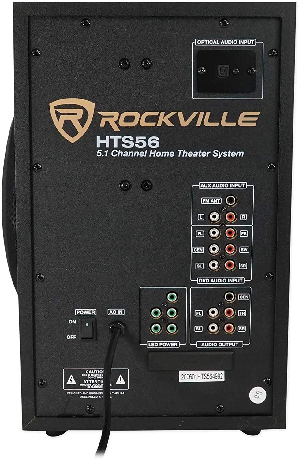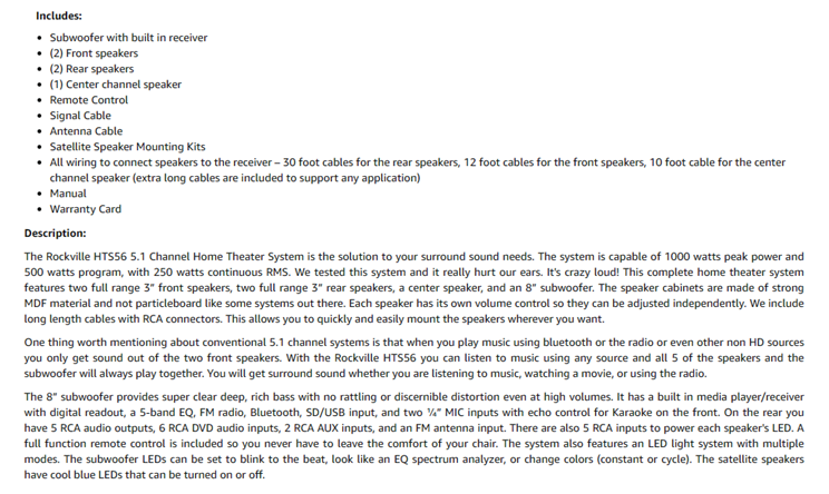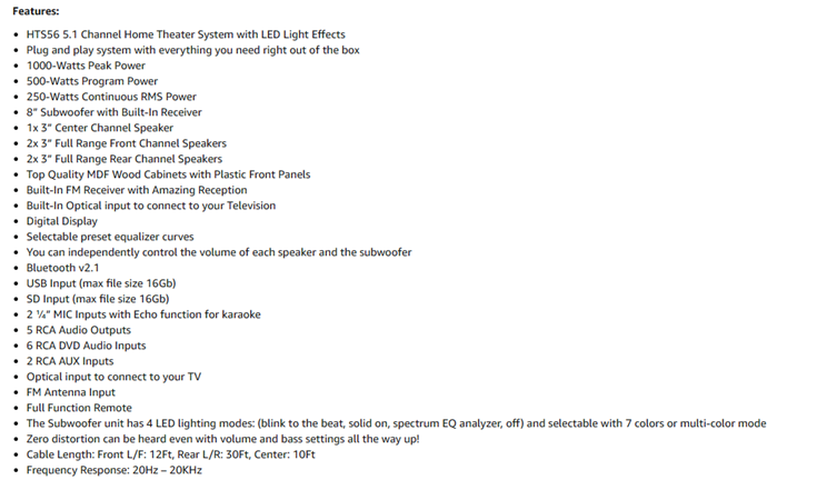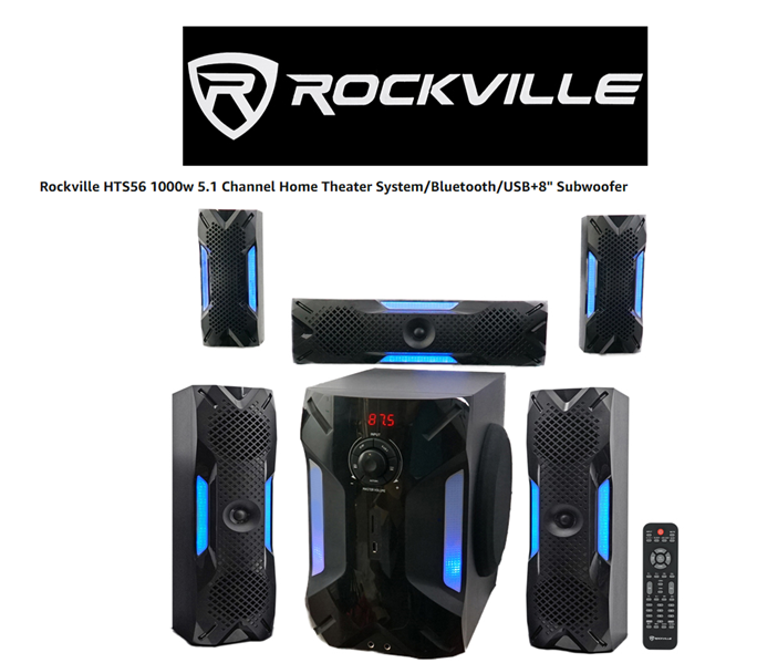 - HTS56 5.1 Channel Home Theater System with LED Light Effects. Plug and play system with everything you need right out of the box. 1000-Watts Peak Power. 500-Watts Program Power. 250-Watts Continuous RMS Power. 8” Subwoofer with Built-In Receiver. 1x 3” Center Channel Speaker.
