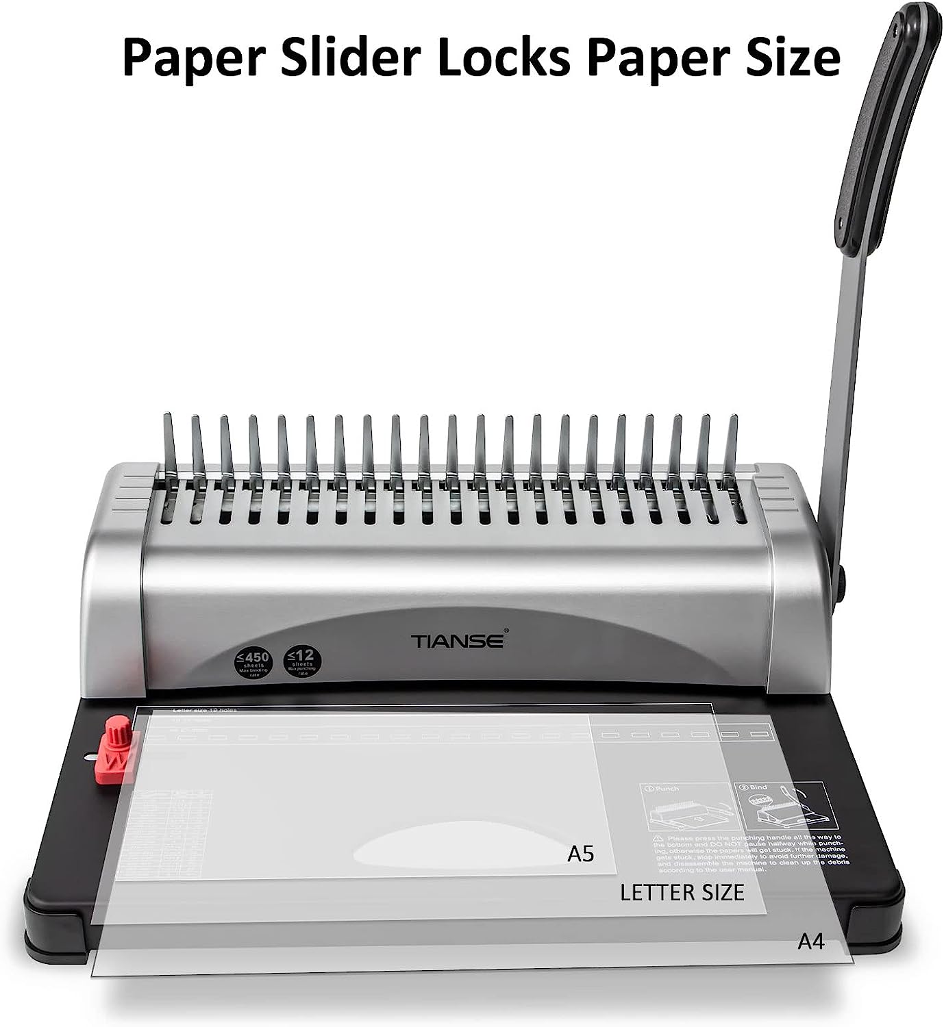 - 【Humanized Design】:TIANSE comb binding machine is suitable for Letter Size (19 holes), A4 Size (21 holes), A5 Size (15 holes). With adjustable edge guide, this machine also ensures a precise alignment with each document your bind, and you can easily customize the paper margin: 3mm, 4mm, 5mm to create professional-looking works.