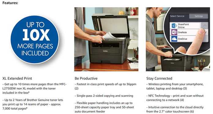This new all-in-one laser printer also offers a “Touch to Connect” feature for printing and scanning with NFC, which increases convenience. Users can print-from and scan-to multiple cloud-based services, directly from the 2.7” color touchscreen, including Google Drive, Dropbox, Evernote, OneNote, and more. This all-in-one is designed with a 250-sheet paper tray that improves efficiency by requiring fewer refills. The MFC-L2750DW XL can handle letter- or legal-sized paper and prints with exceptional quality, regardless of the print size or font used. And we’ve added an up to two year supply of toner, including one high-yield and one super-high-yield cartridge. You can purchase replacement Brother Genuine high-yield toner (TN-760) or super high-yield toner (TN-770) conveniently on Amazon (also compatible with TN-730 replacement toner cartridge).