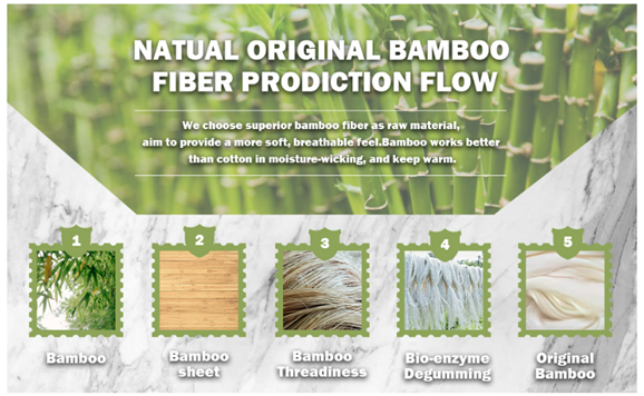• How The fiber made: Cut Bamboo into pieces, boiling and hammer into filaments; Bio-enzymes to obtain the cellulose fiber; Cleaned, bleached, softened the fiber for spinning.