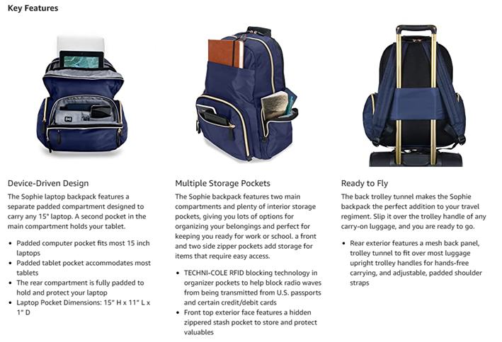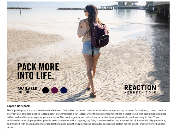 Chic yet sophisticated, the silky nylon "Sophie" women's 15-inch laptop backpack from Kenneth Cole Reaction will have you traveling in style. Packed with features including a spacious fully lined interior, padded laptop pocket that holds most laptops with up to a 15-inch screen, and a front top exterior face features a hidden zippered stash pocket to store and protect valuables. This business savvy nylon computer backpack is made of a stylish, sleek silky nylon exterior with gold plated zippers with a tear-resistant, fully lined pattern printed interior lining. Front main compartment includes a padded tablet pocket, two open slip pockets, with room to hold other needed belongings. Front gusset organizational compartment features an RFID protected flap over accessory pocket, a full-length zipper accessory pocket, a pen loop, and an open top slip pocket. Also features dual side exterior zip around pockets to hold water bottles or accessories. Rear exterior features a mesh back panel, trolley tunnel to fit over most luggage upright trolley handles for hands free carrying, and adjustable, padded shoulder straps, as well as easy to grab top handle for comfortable carrying. Overall Dimensions: 16” H x 13” L x 6” D. ★ Laptop pocket Dimensions: 15” H x 11” W x 1” D. ★ Product Weight: 1.8 lbs. ★