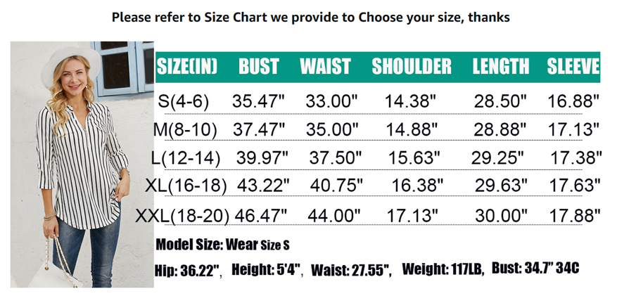 • Model size informations: Bust: 34.7” 34C; Height: 5'4"; Weight: 117LB; Waist: 27.55''; Hip: 36.22''; Model Wear Size S