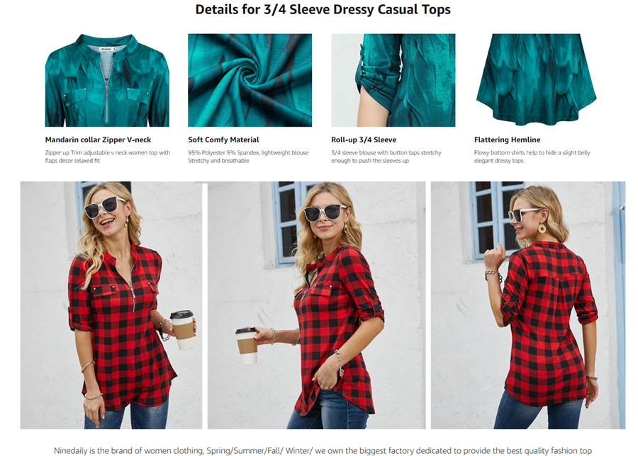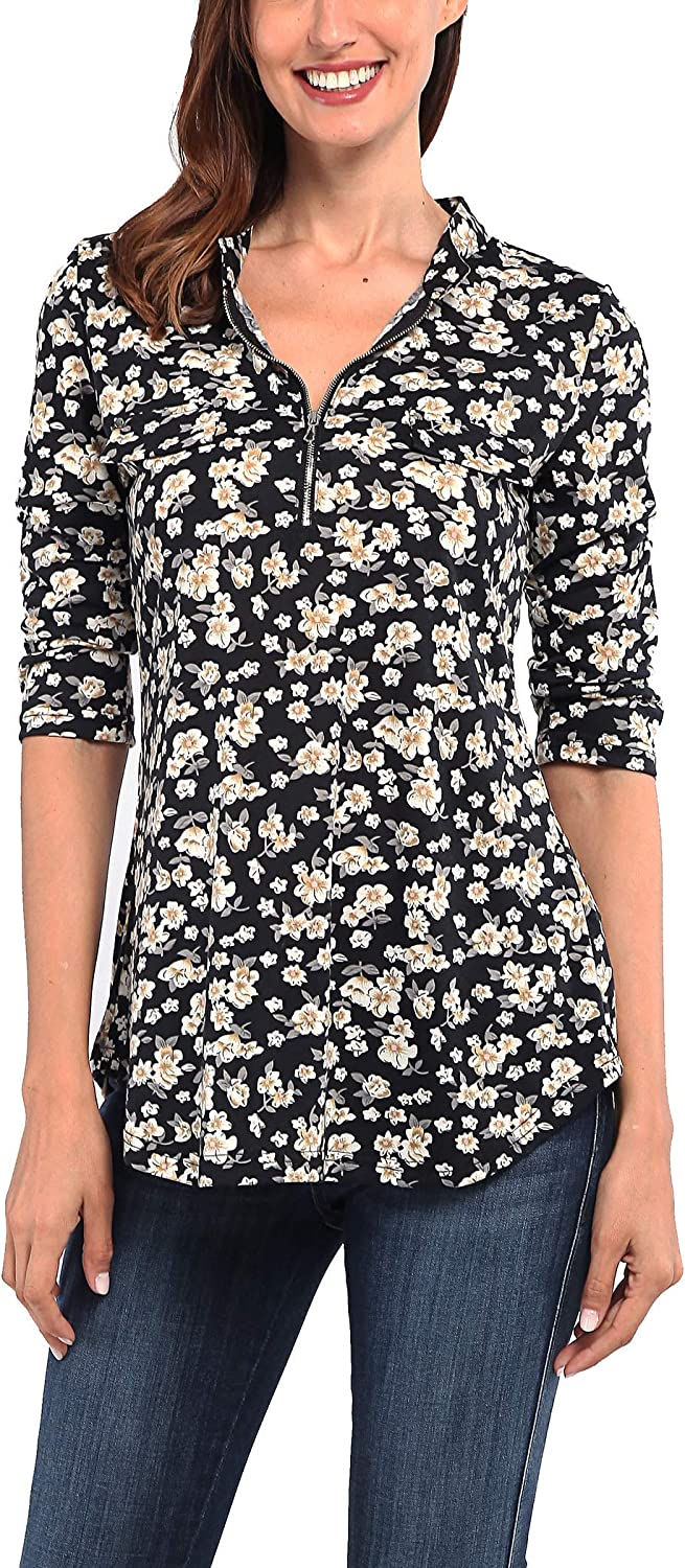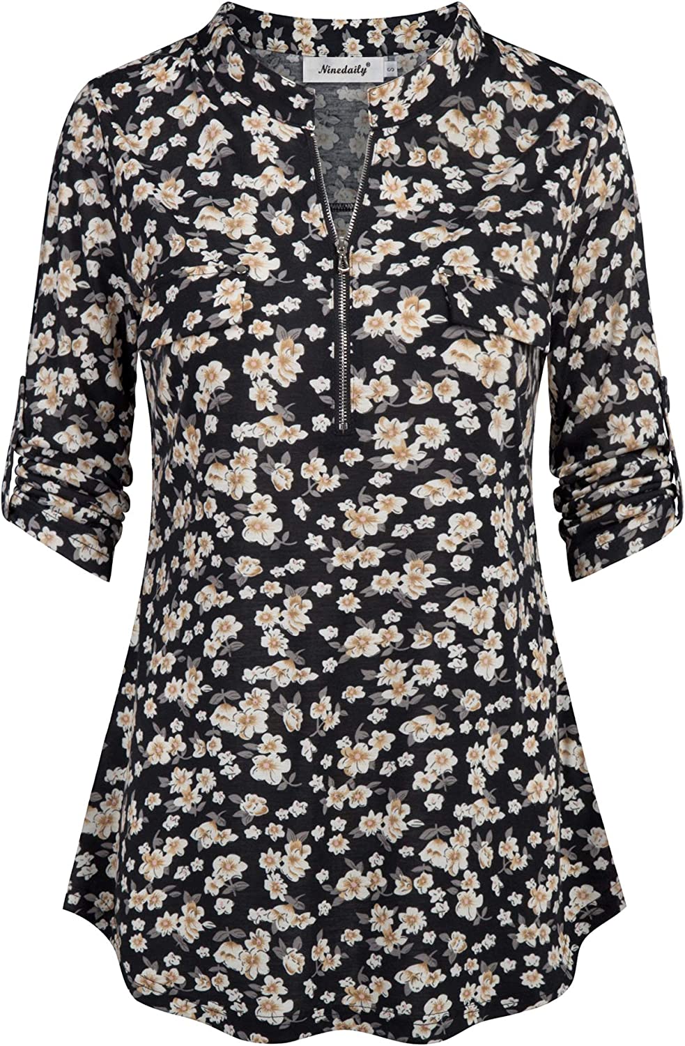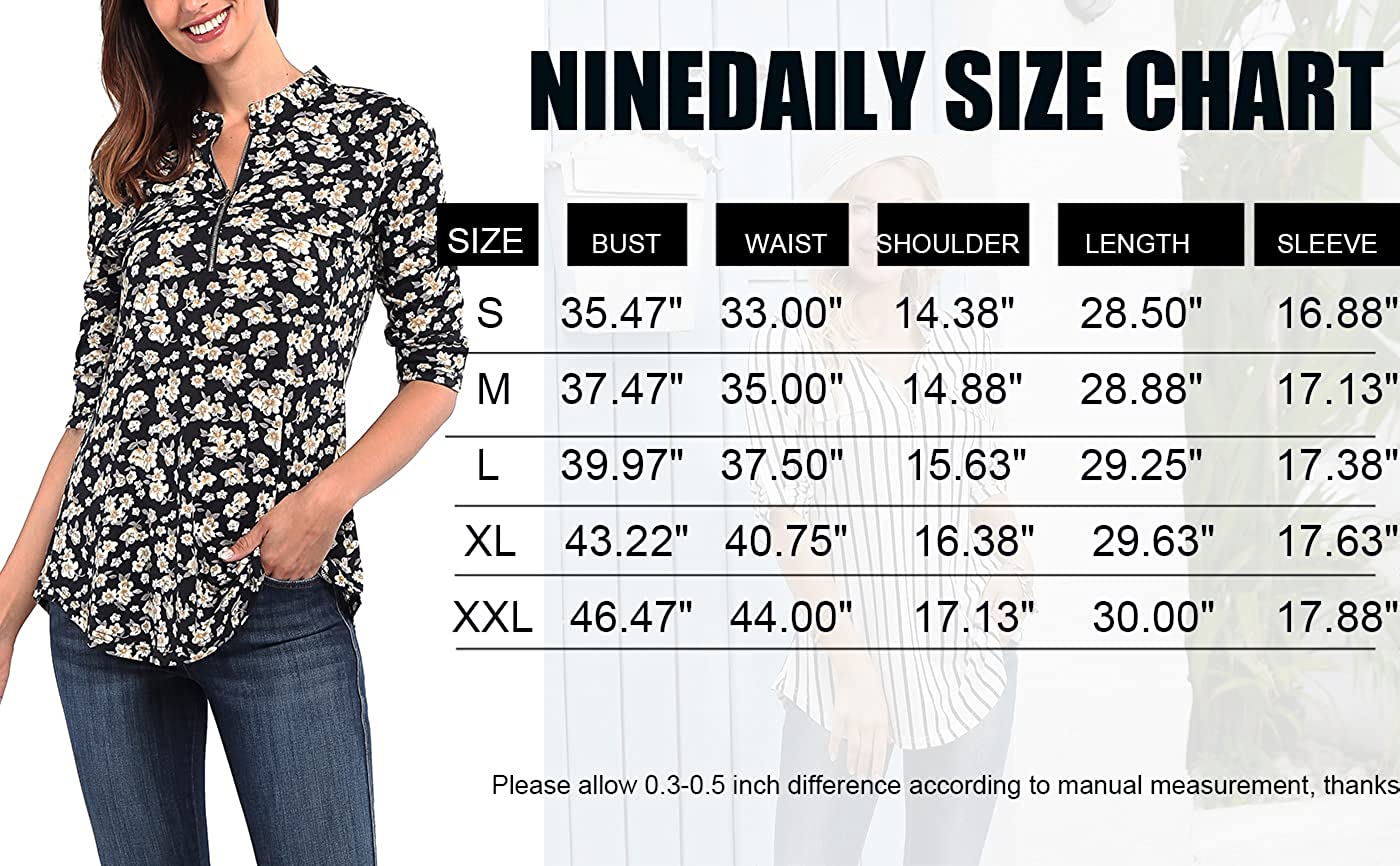 Ninedaily Women's 3/4 Sleeve Plaid Shirts Zip Floral Casual Tunic Blouse Tops