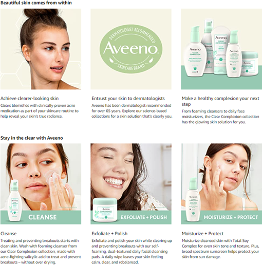 • The Aveeno Clear Complexion collection is designed to clear skin without dulling your natural glow. Each exclusive soy-enriched skincare product, with clinically proven acne medication, clears blemishes and helps reveal your skin's true radiance