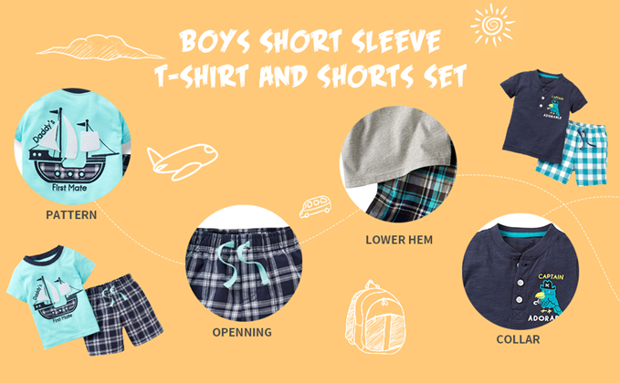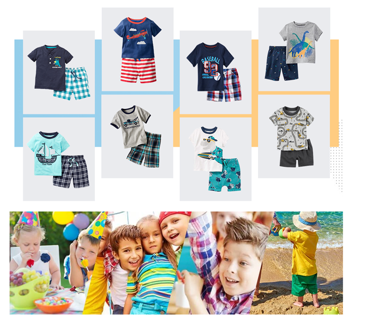 • Car, truck, airplane, dinosaurs,rocket, toys and animal designs on short sets to your child's taste.