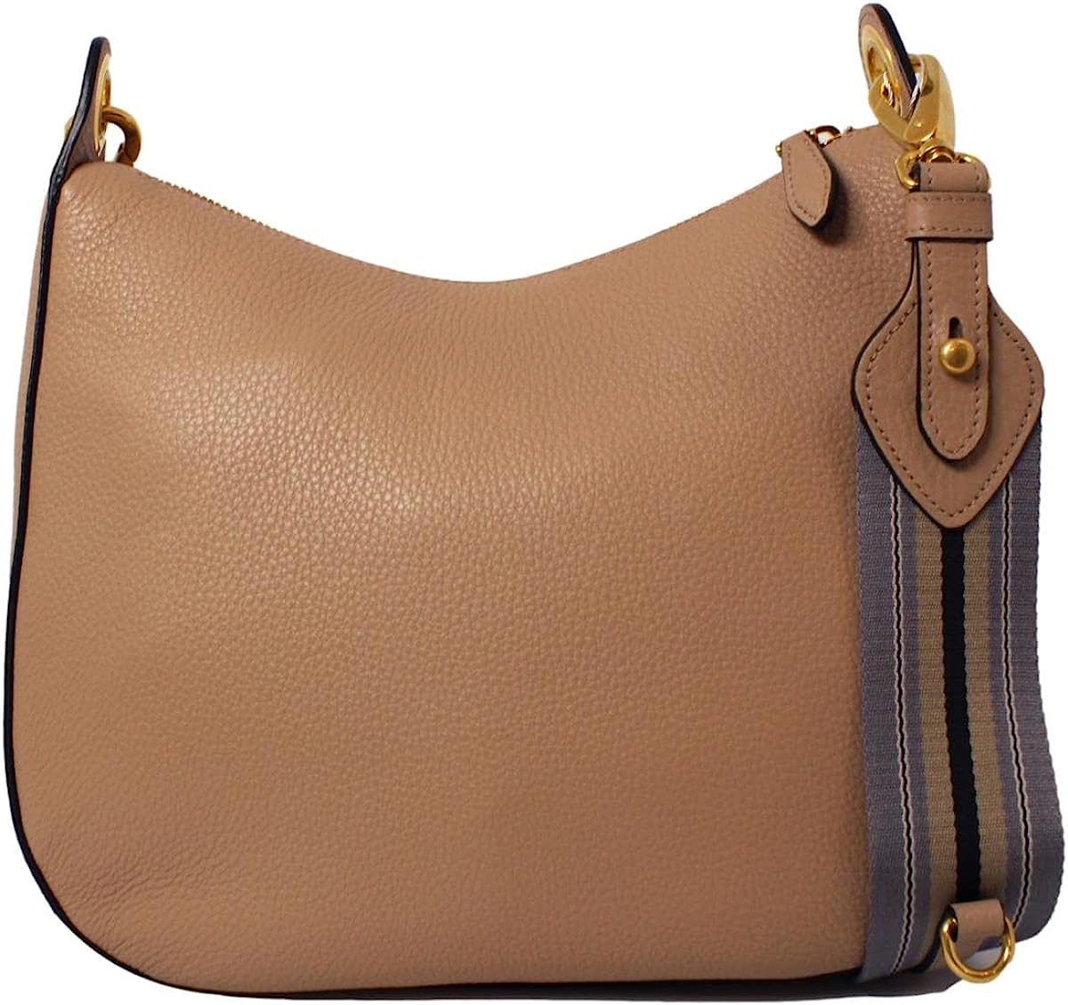 Tan leather with gold Prada Paris logo and silver and blue nylon web striped strap