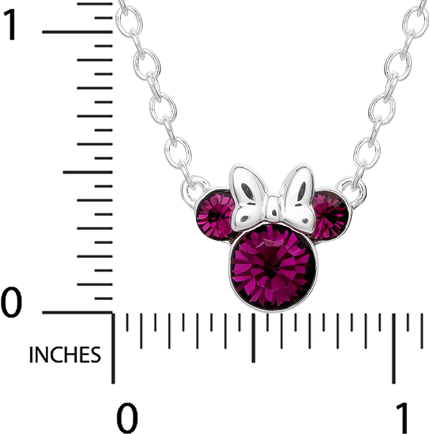 Officially Licensed Disney Jewelry: Silver plated Minnie Mouse pendant necklace featuring the instantly recognizable Minnie icon adorned with gleaming Amethyst Purple Crystals (February)