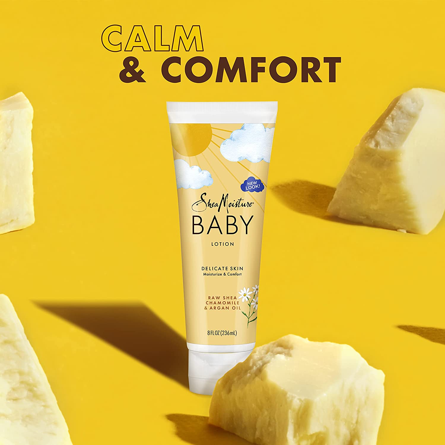 • SheaMoisture's Raw Shea Chamomile & Argan Oil Baby Lotion is made with Fair Trade Raw Shea Butter, Chamomile and Argan Oil for baby eczema to calm and comfort delicate, dry baby skin.