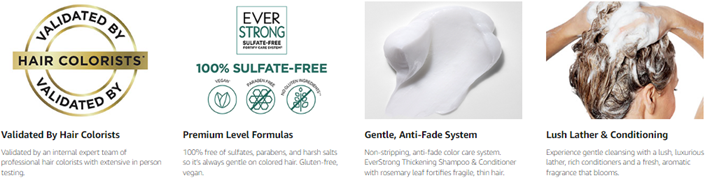 • Thickening- The EverStrong Thickening System fortifies thin hair to promote thicker-looking stronger hair.Cruelty free