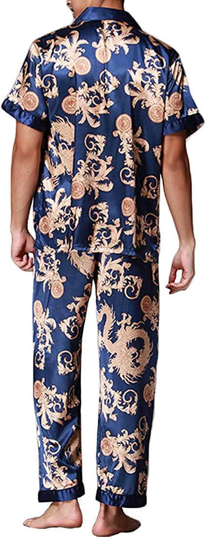 ZUEVI Men's Silk Satin Pajamas Set Short Sleeve Dragon Pattern Pjs Sets Classic Loungewear Button-Down Sleepwear