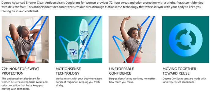 Degree is upgrading to our best formula yet. Our new and improved formulation gives you 72 hours of nonstop sweat and odor protection. You will still find all the same fragrances you know and love, but now with our new and improved long lasting protection. For a limited time, you may still receive our old 48-hour formulation while all our new 72-hour products make their way to a store near you. Degree Advanced Shower Clean Antiperspirant Deodorant delivers nonstop protection, so you can face the day with confidence. This antiperspirant for women features 72-hour sweat and odor protection and the bright floral scent of rose and jasmine, blended with delicate fruit for an invigorating, clean feeling. Only Degree has MotionSense technology that moves in sync with your body. This antiperspirant deodorant spray releases a burst of subtle fragrance every time you move, for nonstop protection. Degree Advanced Shower Clean Antiperspirant Deodorant keeps you feeling fresher, drier, and more confident. At Degree, we’re doing everything we can to help keep the planet moving. That’s why we're increasing our use of reusable materials, making it easier for you to recycle our antiperspirant and dry spray packaging. Degree it won’t let you down.