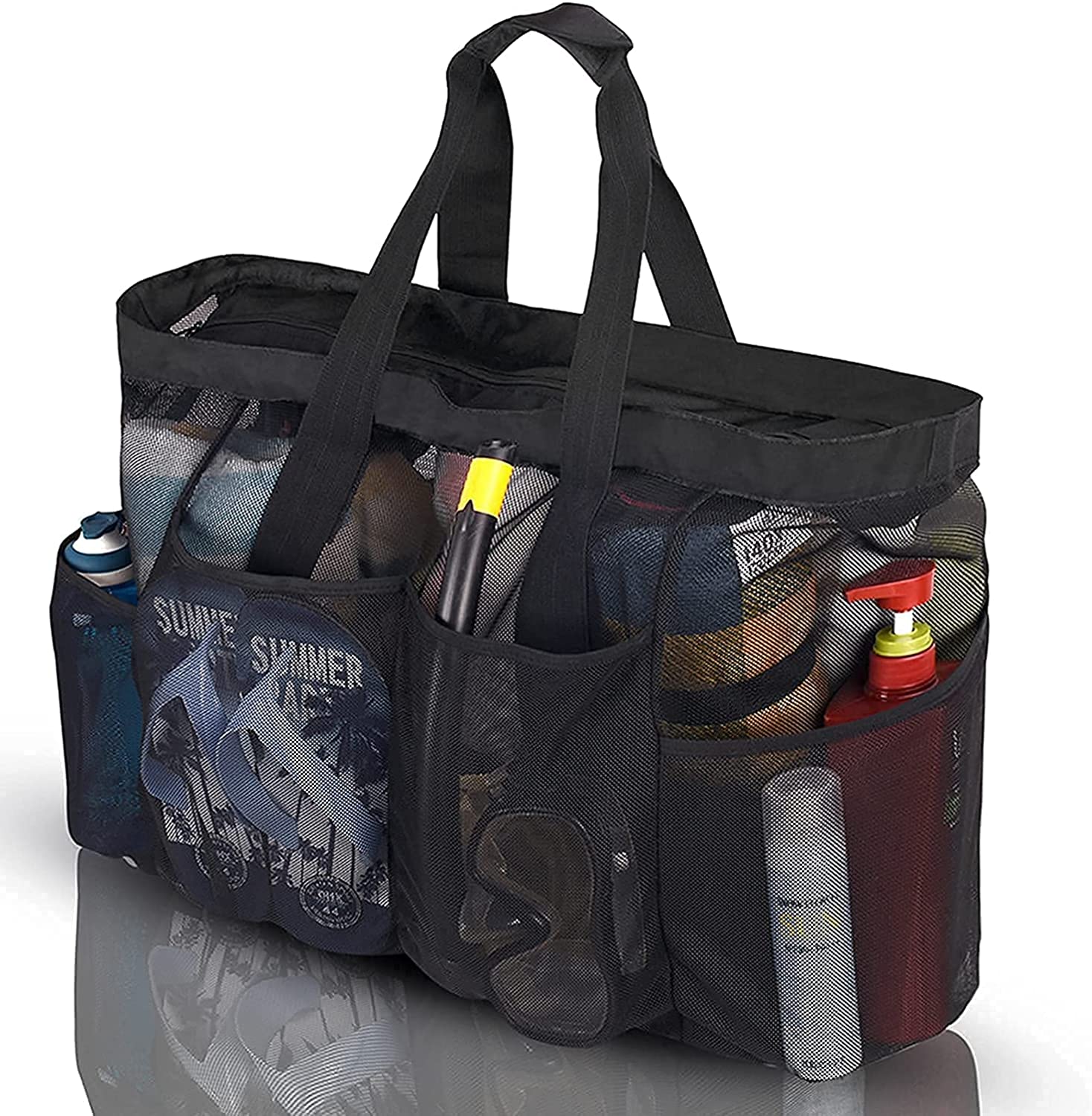 【 WITH MORE EXTRA POCKETS 】 - Our black mesh beach bag with 4 outside pockets and 1 inside zippered pocket. 4 deep outside pockets for your extra stuff like water shoes, water bottles... The 1 inside zippered pocket for your valuables like phone, wallet and key...
