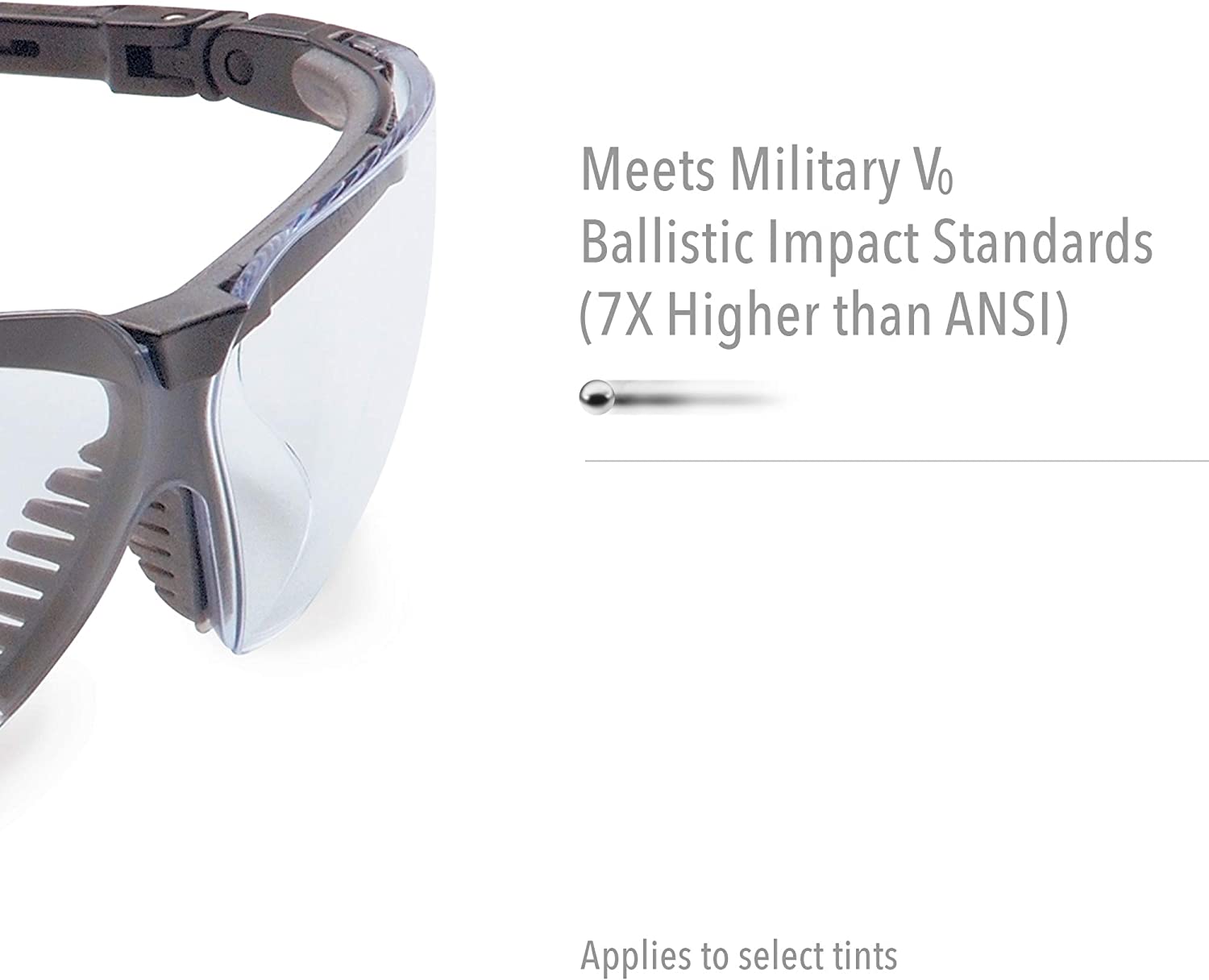 Uvex Genesis Safety Glasses are engineered for comfort, protection and style, Our Genesis line is the number one selling premium protective eyewear in the market, delivering an incredible range of superior product benefits. Built with MMT (Multi-Material Technology), these safety glasses offer the highest available impact safety: military V0 ballistic test protection against impact energies 7X higher than ANSI requirements (on select tints). They are also certified to meet CSA Z94.3 standards. Some models also feature an advanced TPE frame formulation that performs exceptionally well in environments where chemical mist, cutting oils and high moisture are present. The wraparound 9-base uni-lens offers excellent side coverage and peripheral vision, and the adjustable temple length & lens inclination makes for a truly customized fit. Unique comfort features include a soft elastomer browguard to diffuse impacts, and soft, flexible nose fingers that reduce slippage and conform to almost any nasal profile. A ventilation channel between the frame and lens vents the eye socket area to deliver an outstanding level of moisture and fog control. Genesis safety eyewear also boasts an easy and economical lens replacement system to extend the life of your glasses. Uvex Genesis Safety Glasses are available with multiple lens tints to suit almost any work environment. Uvex stands for "Ultra Violet Excluded", which means our safety glasses employ specifically formulated resins that filter 99.9% of the UV radiation in accordance to the U6 scale of the Z87 standard. Uvex has also developed Spectrum Control Technology (SCT), which incorporates unique dyes designed to absorb select wavelengths of radiant energy (light). Our anti-glare glasses, tinted safety glasses and safety sunglasses are designed to manipulate light to reduce a spectral hazard, or to provide distinctive filtration for specific safety eyewear viewing tasks. Examples include filtering solar radiation to reduce glare, and blocking radiation from welding to protect workers around these operations. Multiple anti-fog and anti-scratch coatings are also available. The new HydroShield technology provides our best anti-fog lens coating, keeping your vision clear up to 90X longer than most other competitive anti-fog safety glasses. The Uvextreme anti-fog coating offers great, dual-action performance under demanding hot and humid conditions for long lasting fog-free performance. Our Ultra-Dura hardcoat makes for some of the toughest scratch-resistant safety glasses in the world. Permanently bonded to the lens, it offers unparalleled scratch and chemical resistance. The dual anti-fog/anti-scratch Dura-Streme coating combines the benefits of our industry-leading Uvextreme anti-fog coating and our Ultra-Dura anti-scratch hardcoat. While the advanced anti-fog properties of Uvextreme help keep the interior of the lens clear from fogging, the rugged properties of Ultra-Dura protect the exterior of the lens from scuffs and scratches, adding up to three times more life to lenses.