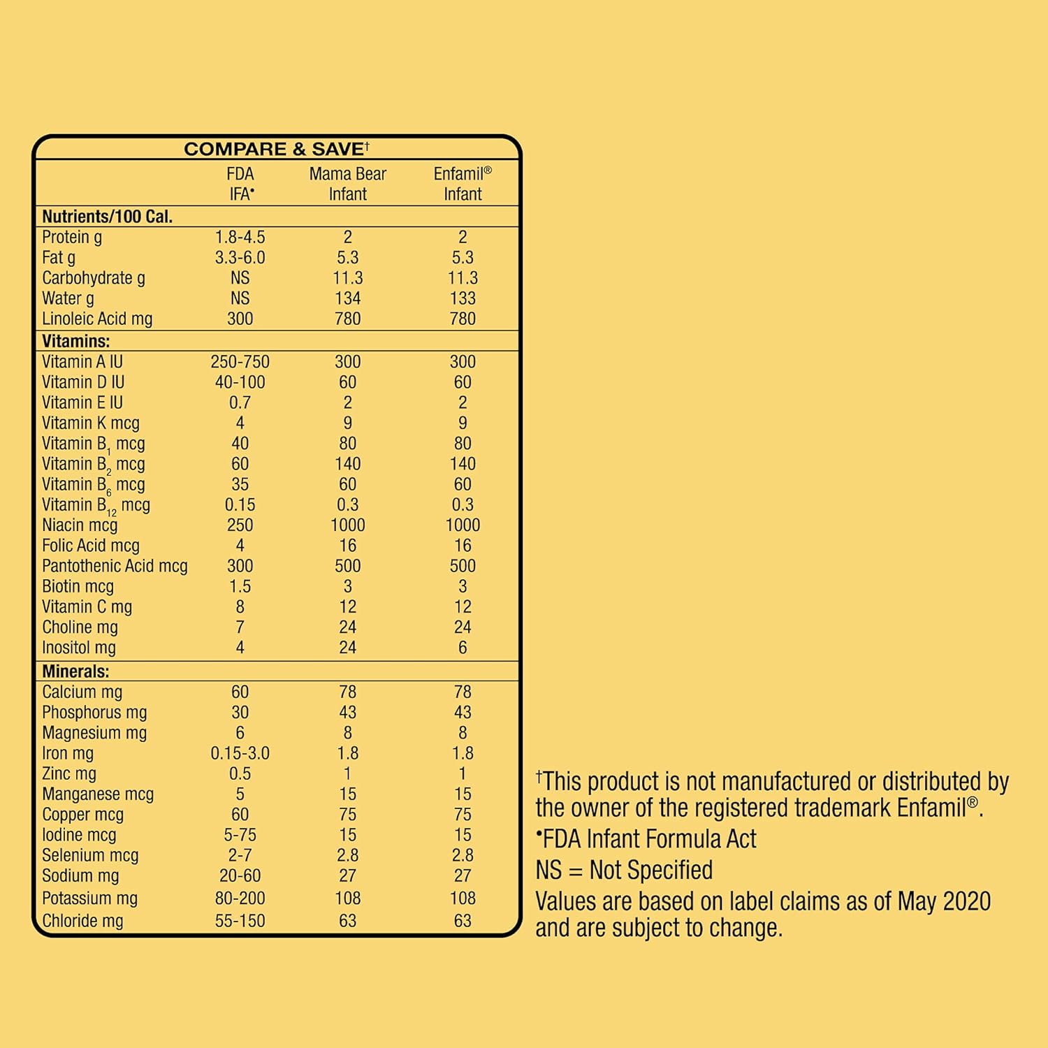 • FDA REQUIREMENTS: Like all baby formulas sold in the U.S., Mama Bear Infant baby formula powder meets U.S. FDA requirements, same as the national brand