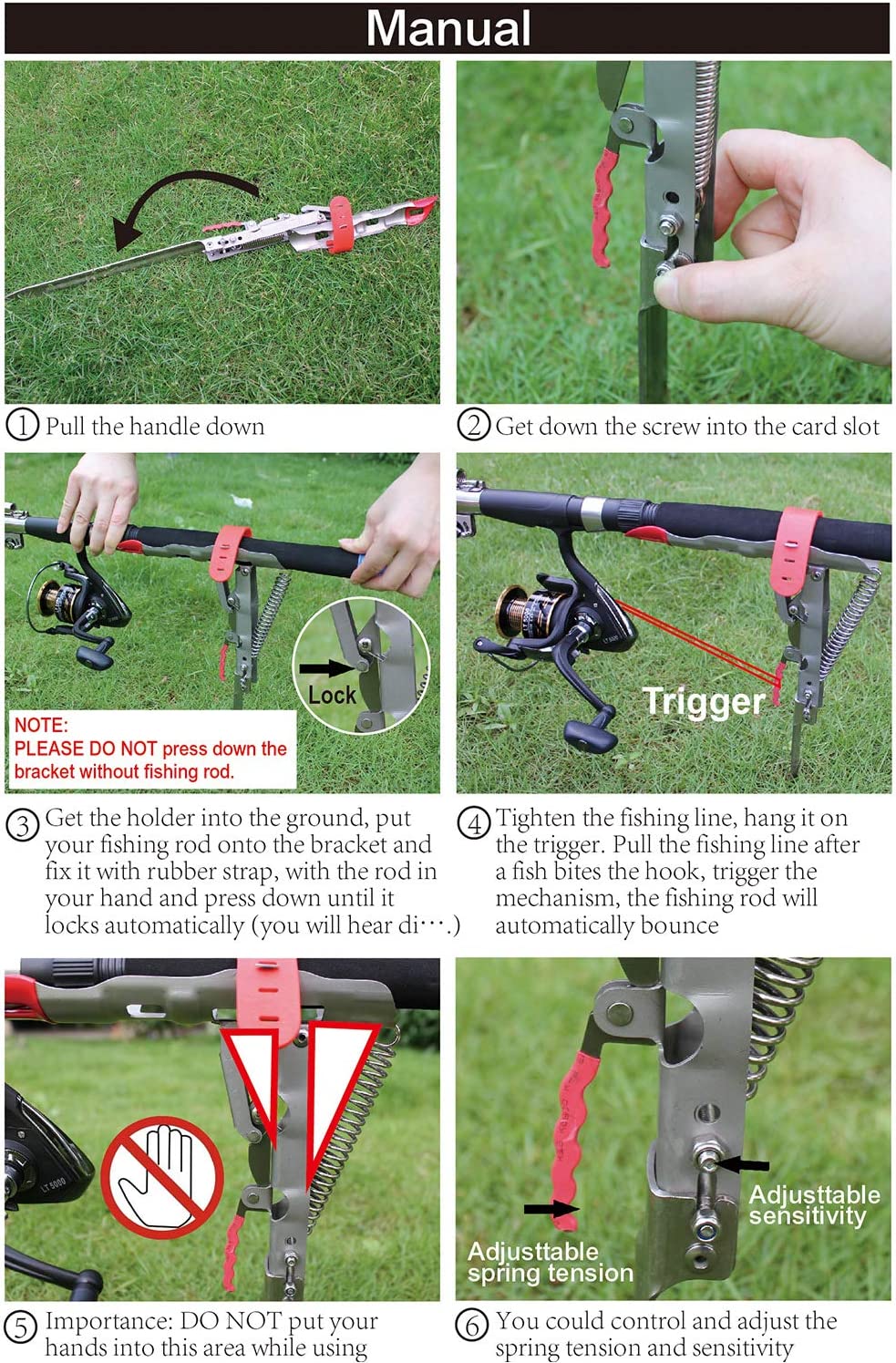 - 【Rust Corrosion Resistance & Portable】Automatic fishing pole holder is made of 304 stainless steel and rubber construction, Rust- Proof, Strong and Abrasive Resistance. Compact folding, small packed, ideal for store and transport. Great for Bank Fishing, Lakes, Ponds, River and Streams. 【NOTICE: The bank fishing rod holder is required to be tested with fishing pole. Please operate this fishing rod holder referring to the instruction, a video on the left of the product page to show how to test】