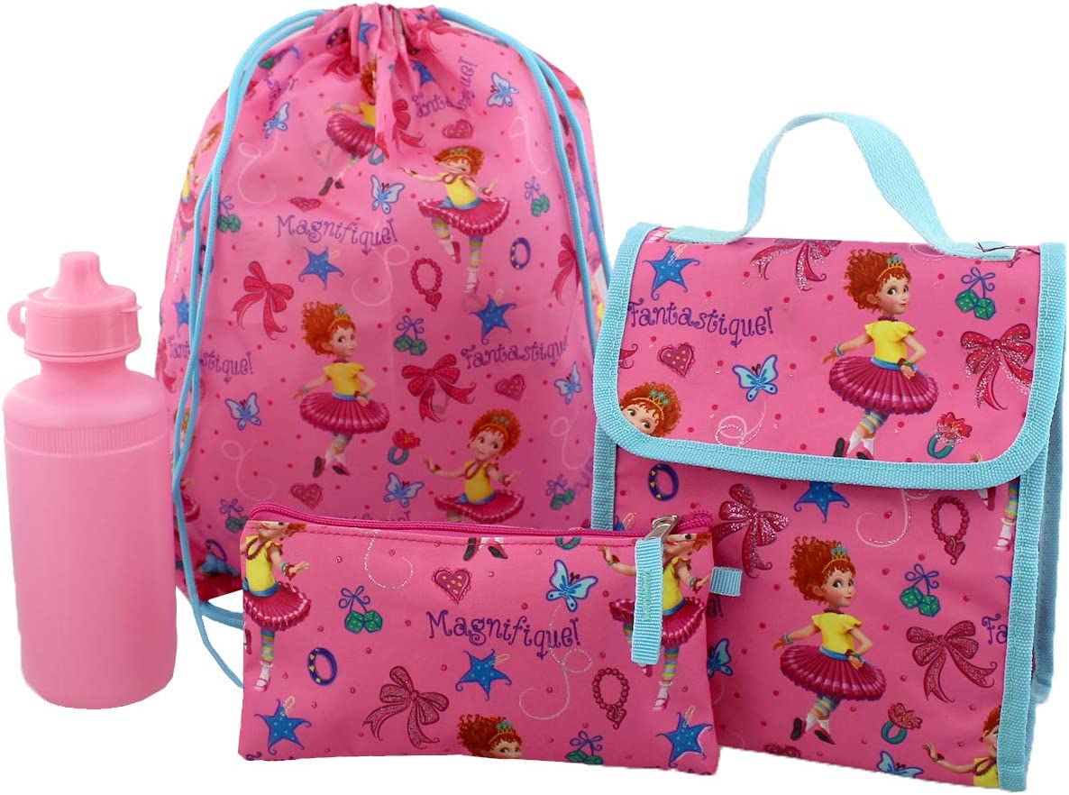 Get ready for the day with this stylish Yankee Toy Box exclusive Fancy Nancy backpack and snack bag school set! This set includes a 16 inch backpack, a fold-able insulated snack bag, a soft utility pencil case, a drawstring sack, and a pop top water bottle. You can easily carry books, gym clothes, pencils, and other school supplies! The day pack features a roomy main compartment, two side pockets, and a front zip compartment that is perfect for smaller supplies. The book bag can be hung up when not in use by the padded locker loop. The matching snack bag makes snack time fun and exciting with a thinly insulated interior, hook and loop closure, and a holding strap for easy carrying. This Fancy Nancy school bag is designed in durable fabric with adjustable padded shoulder straps and a padded back for added comfort. The side mesh pockets are made from durable athletic mesh. The soft accessory case and is great for storing smaller items. This set features your favorite Disney Jr. Fancy Nancy character: Fancy Nancy! It's the perfect travel, school, or camp set for any girl or toddler girl that loves Fancy Nancy!