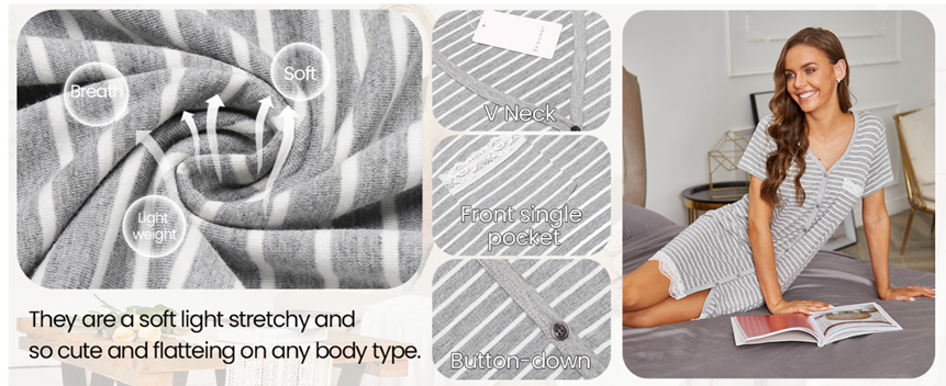 Short-sleeve & knee-length pajama dress, feeling much freedom while you are walking. It is a great choice to wear this nightshirt while watching TV with your family or your friend.