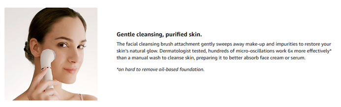 - GENTLE: facial cleansing removes make-up and impurities 6x more effectively than manual wash