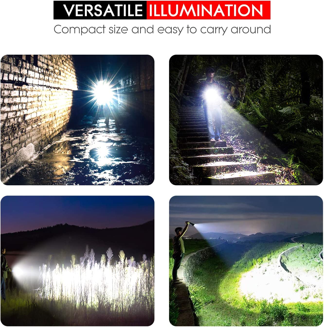 • 【WATERPROOF & TOUGH】Led flashlight is built with IP67 waterproof, now you can stop worrying about unexpected weather rain or snow. Its durable, anodized machined aluminum construction promises long-time durability, no matter where you go, best flash light for camping, hiking, emergency situations.