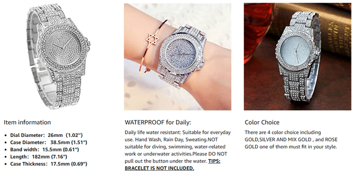 | Special features | silver watch for women, watches for women, lady watch, bling watch, diamond watch for women |
