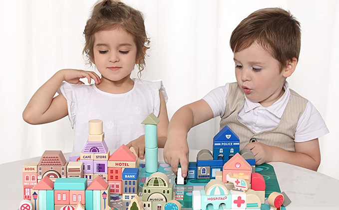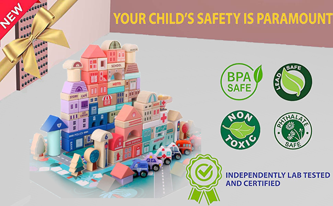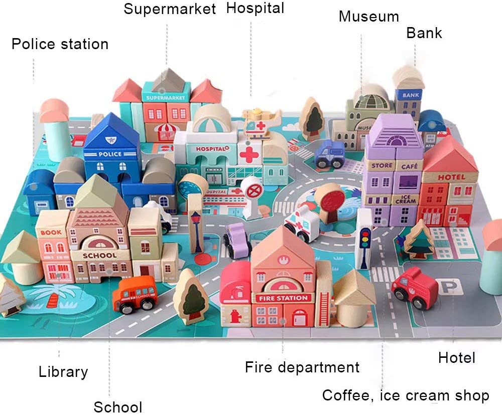 • ? NATURAL WOODEN TOY?:This toddler Building blocks toy is made of high quality wood, BPA Free and stained with bright non-toxic water-based paint,sanded smooth, and finished with safe, manufactured to the highest grade. The blocks are easy for your kids to grasp, perfect for your children to stacking various of buildings. such as hospital, hotel, police station, bank, store.