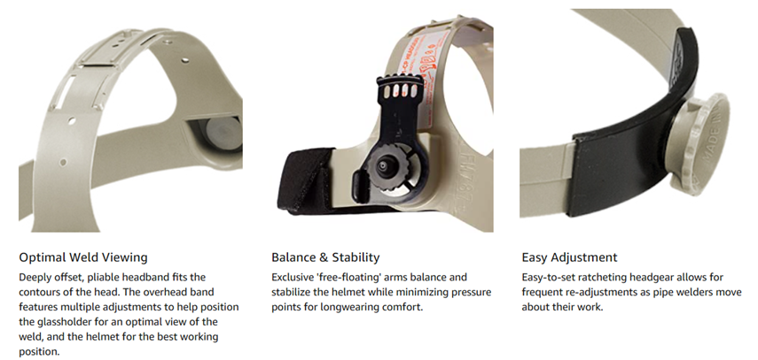 • RATCHETING HEADGEAR: Easy-to-set, ratcheting headgear assures comfortable, secure fit; overhead band has multiple adjustments to set the welding mask for the best working position and optimal weld viewing