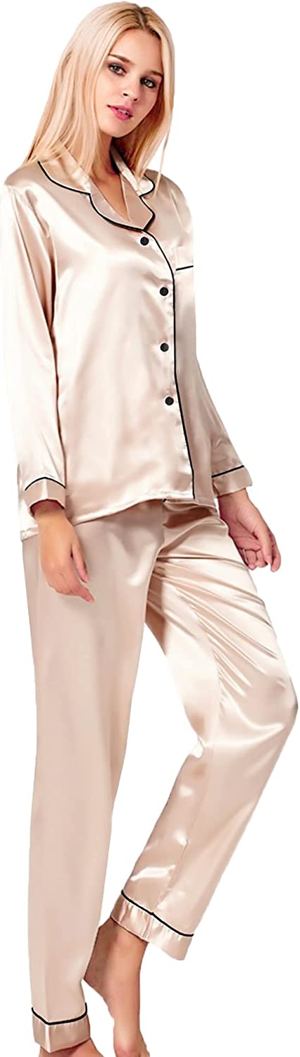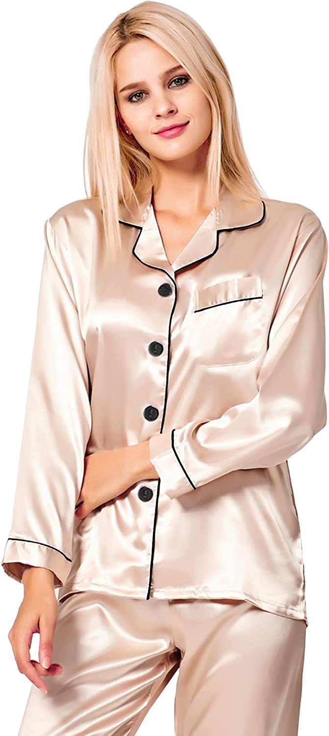 SWOMOG Womens Silk Satin Pajamas Loungewear Two-piece Sleepwear Button-Down Pj Set