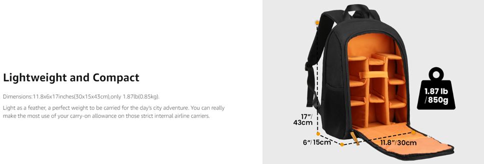 - 【Professional Camera Backpack with 15inch Laptop Compartment】 8 pieces padded removable dividers can be reorganized and offer certain protection for your own camera equipments. Camera tripod can be attached to the bottom of the camera bag. Dedicated 15inch laptop/tablet pocket.