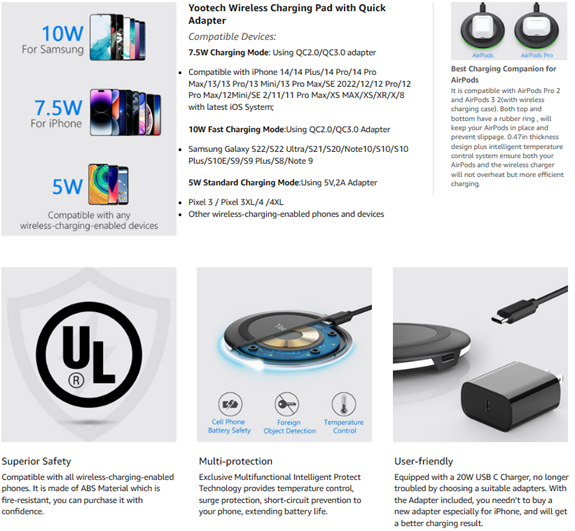 • ▶[PACKAGE AND SERVICE]: You will get 1 x Wireless Charging Pad, 1 x 3. 3ft USB C-C Cable, 1 x 20W USB C Charger, User Manual and reliable 12-hour response service. At Yootech, zero risk purchase is for every customer's smiles.